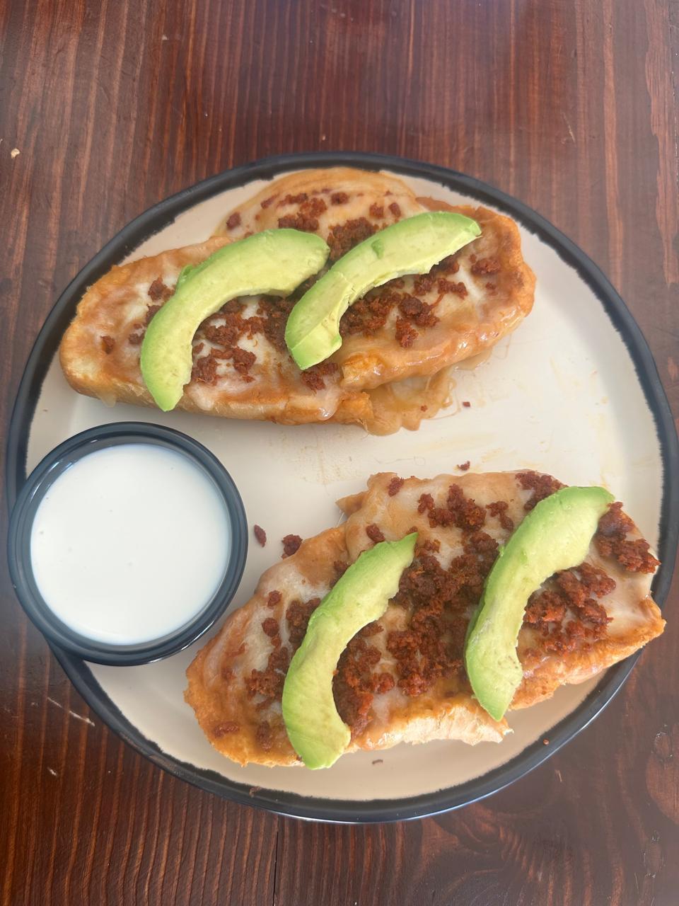 Bolillo cortado a la mitad, con frijoles refritos, cubierto con queso cheddar gratinado y longaniza de Valladolid. Se sirven calientes y acompañados con pico de gallo, aguacate y crema.