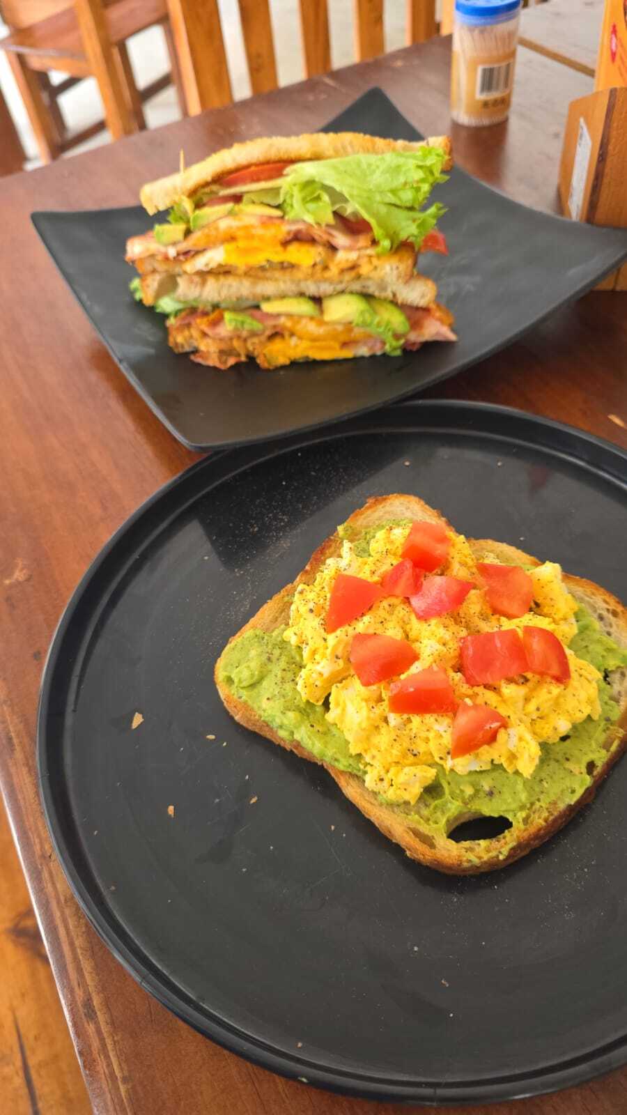 Dos panes de masa madre ligeramente tostados, cubiertos con guacamole, acompañados de huevos, papas y pico de gallo para darle un toque extra de sabor.