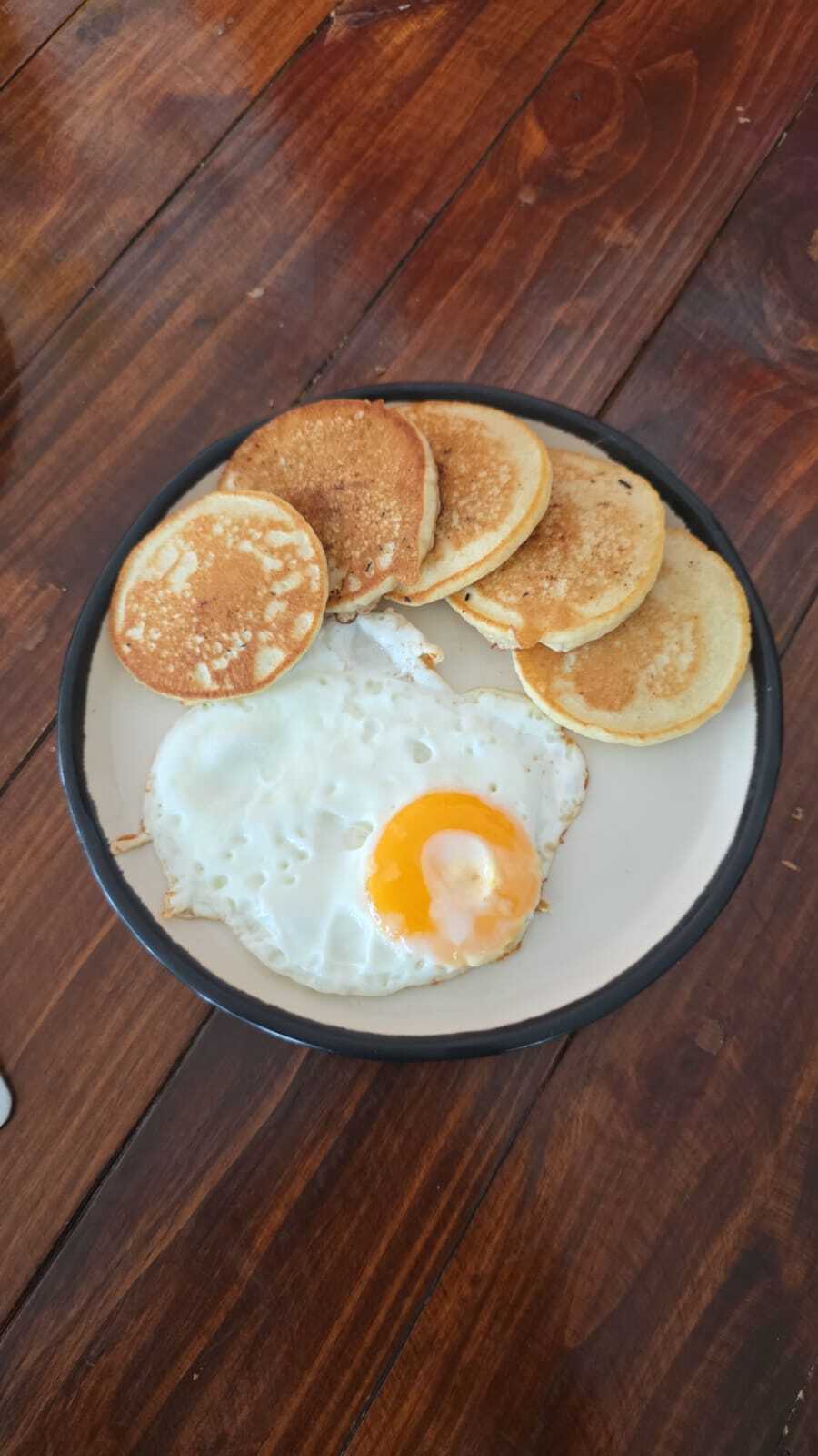 Cinco mini hot cakes acompañados de un huevo y fresa.