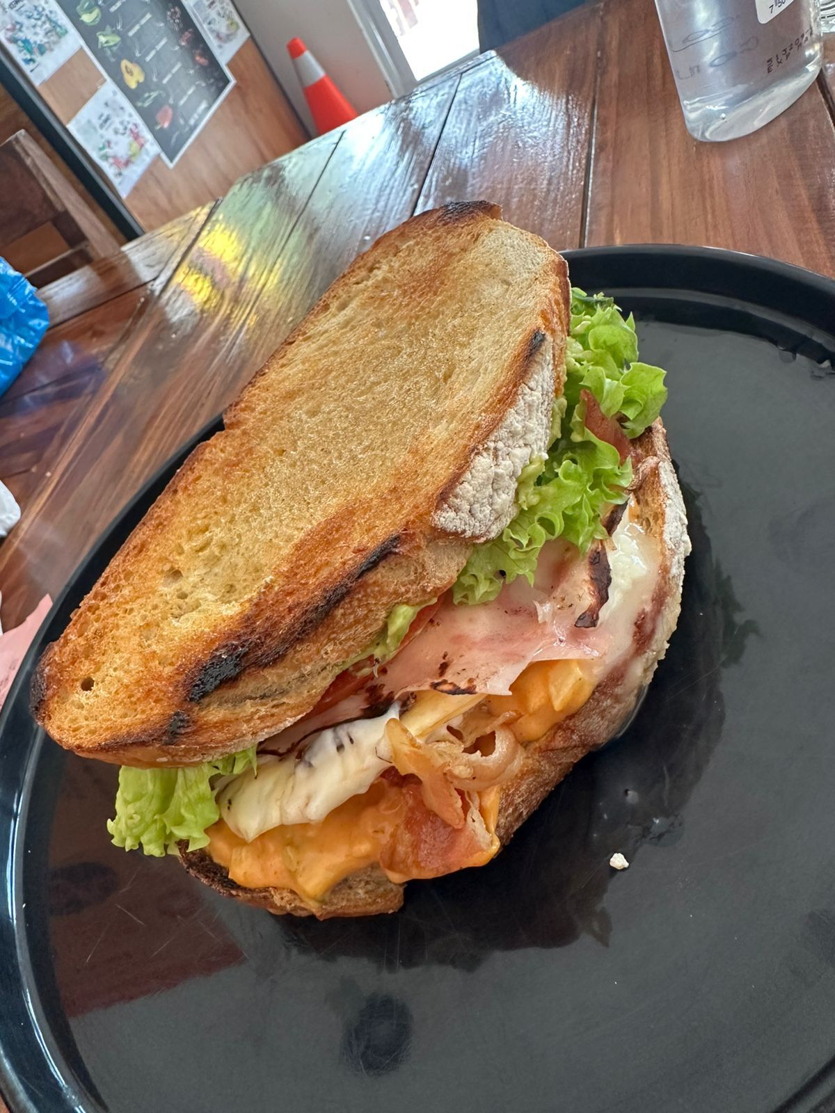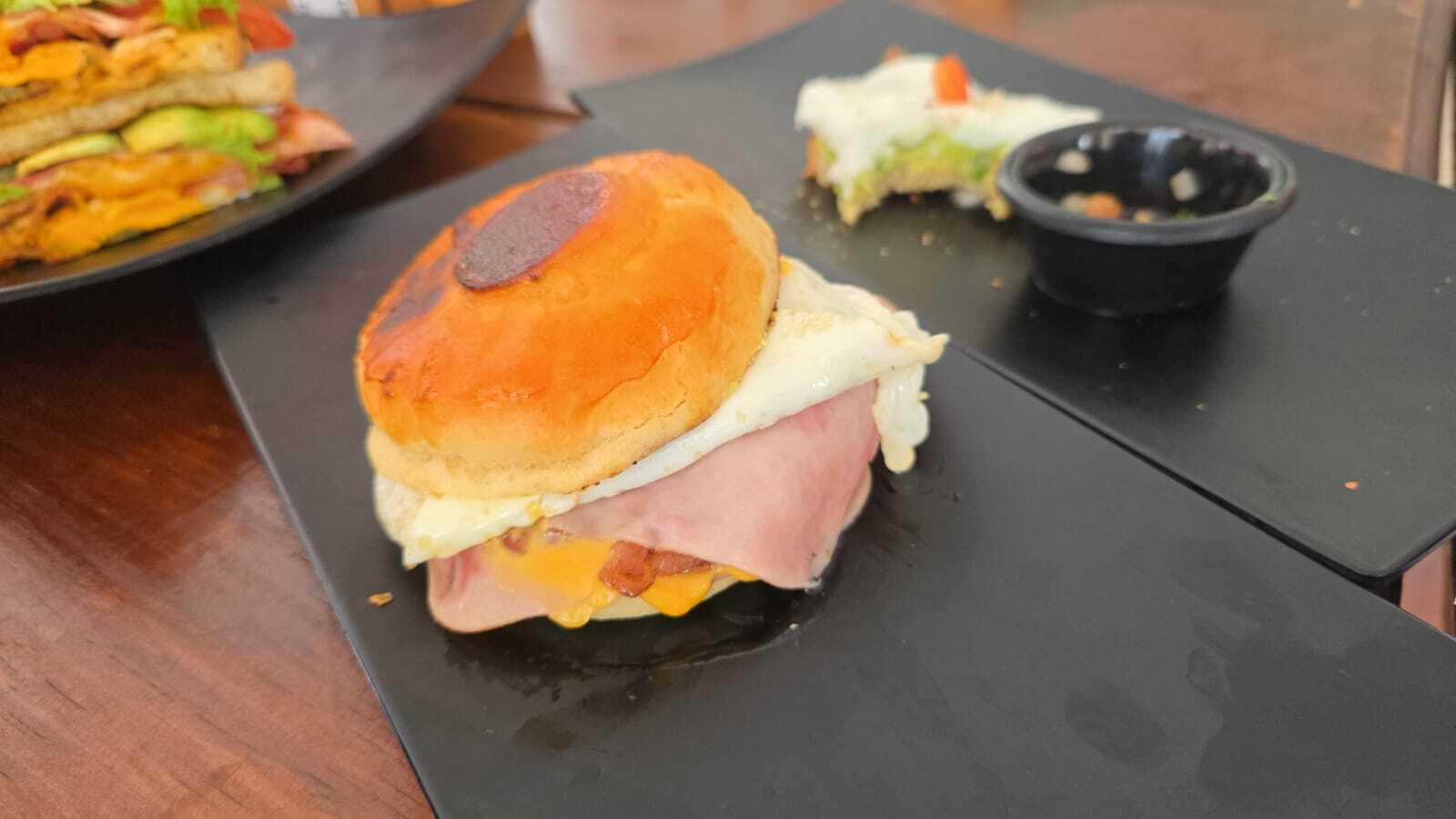 Sándwich clásico en pan de masa madre con jamón, tocino, queso cheddar, dos huevos, lechuga romana, tomate, cebolla morada y aderezo de la casa, acompañado de papas o pretzels.