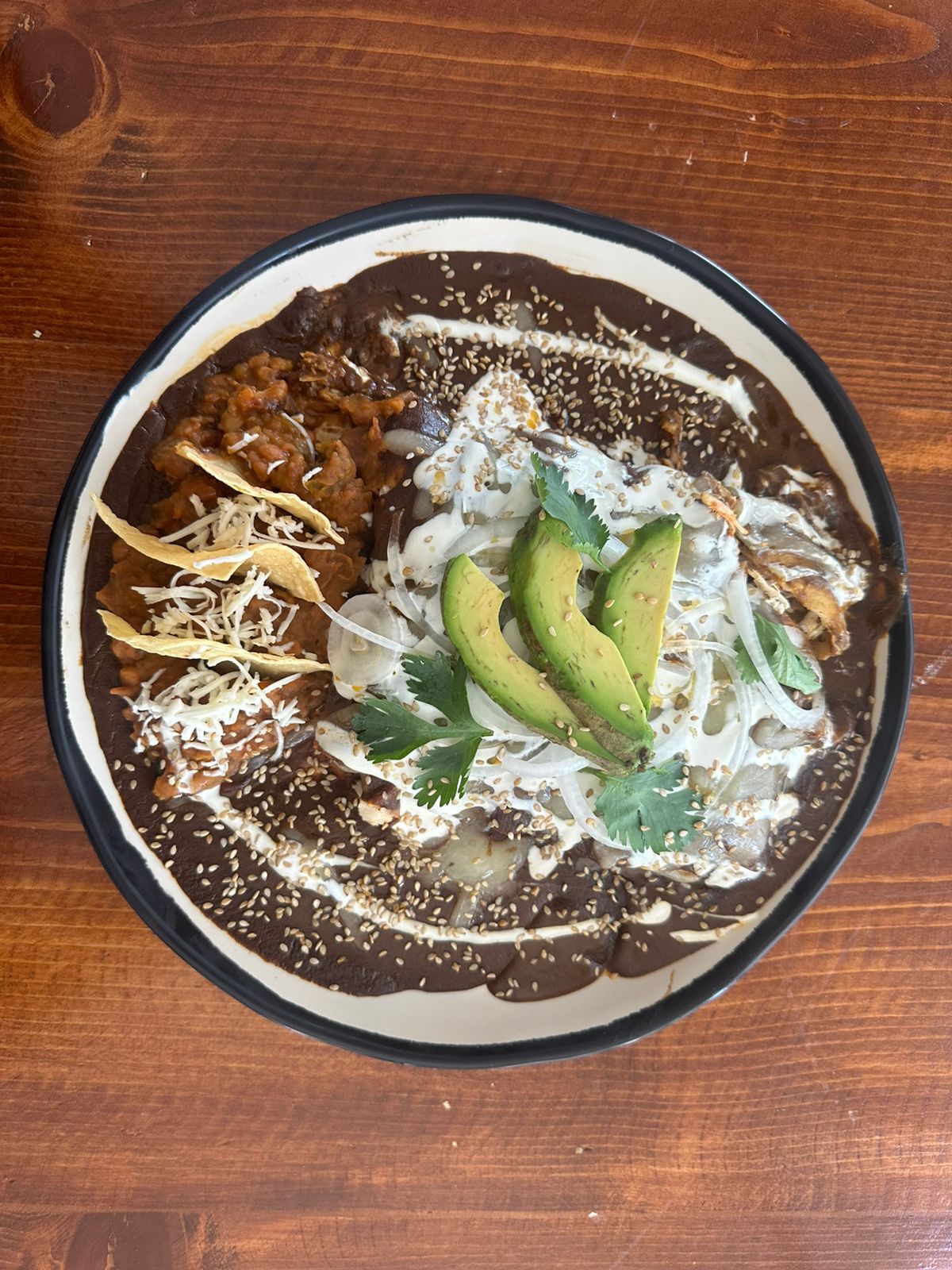 Enchiladas rellenas de pollo, cubiertas con queso, media crema, cebolla blanca y cilantro, acompañado de frijoles refritos.