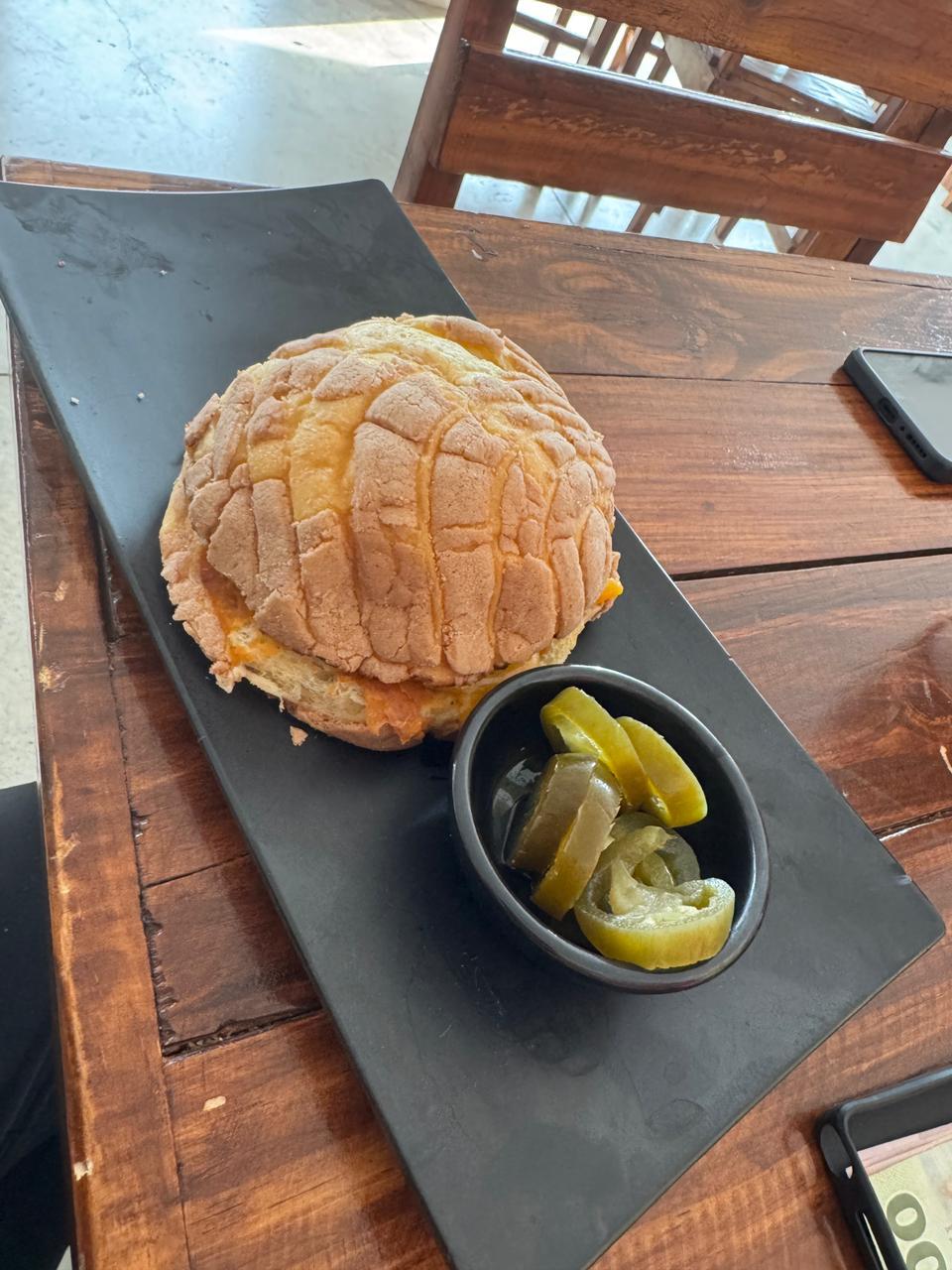 Concha artesanal rellena de frijoles refritos, chorizo, queso y aderezo de la casa, servida con papas o pretzels.