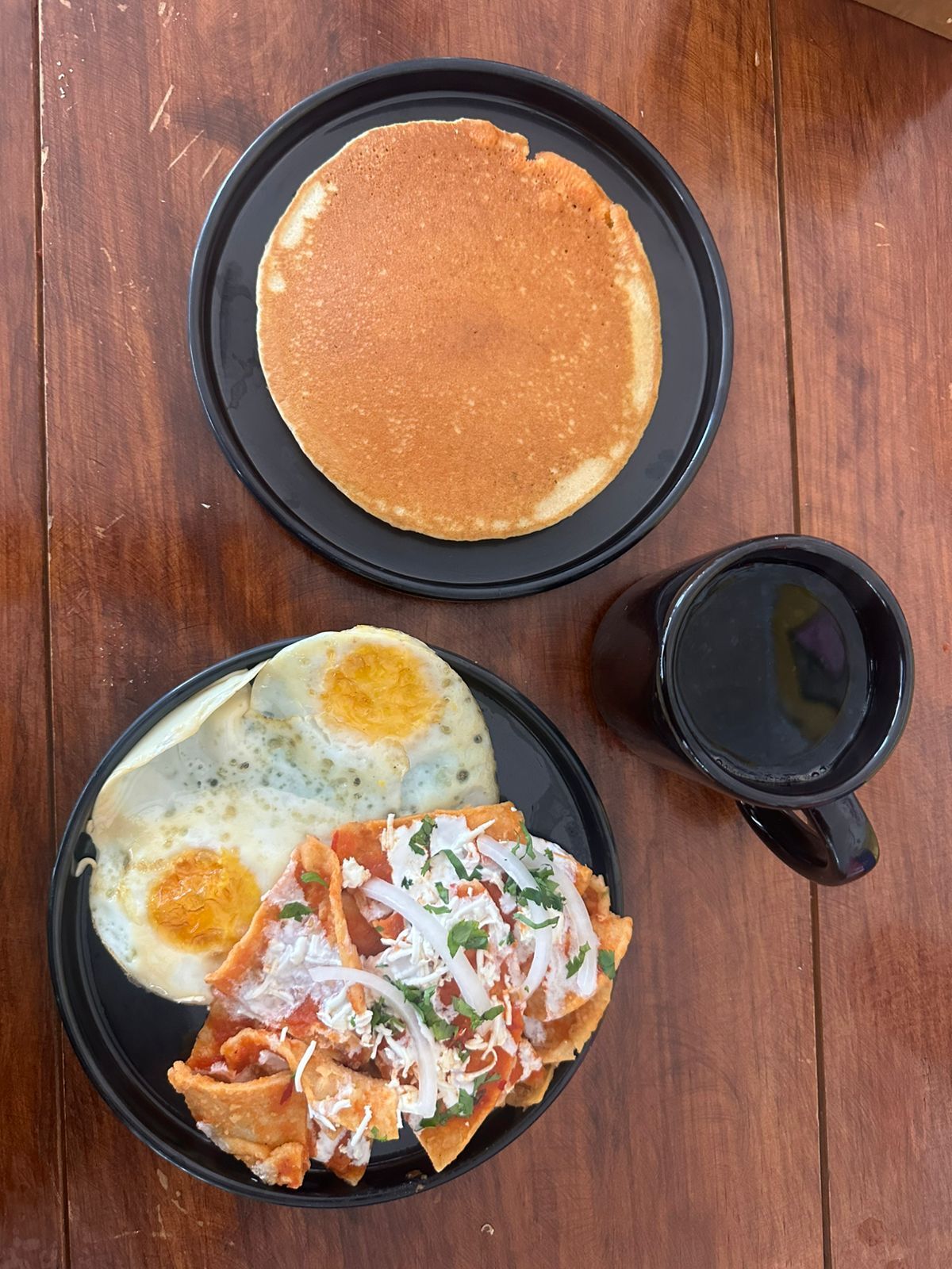 Desayuno completo con una porción de chilaquil, un hot cake, dos huevos, fruta y café refill americano.