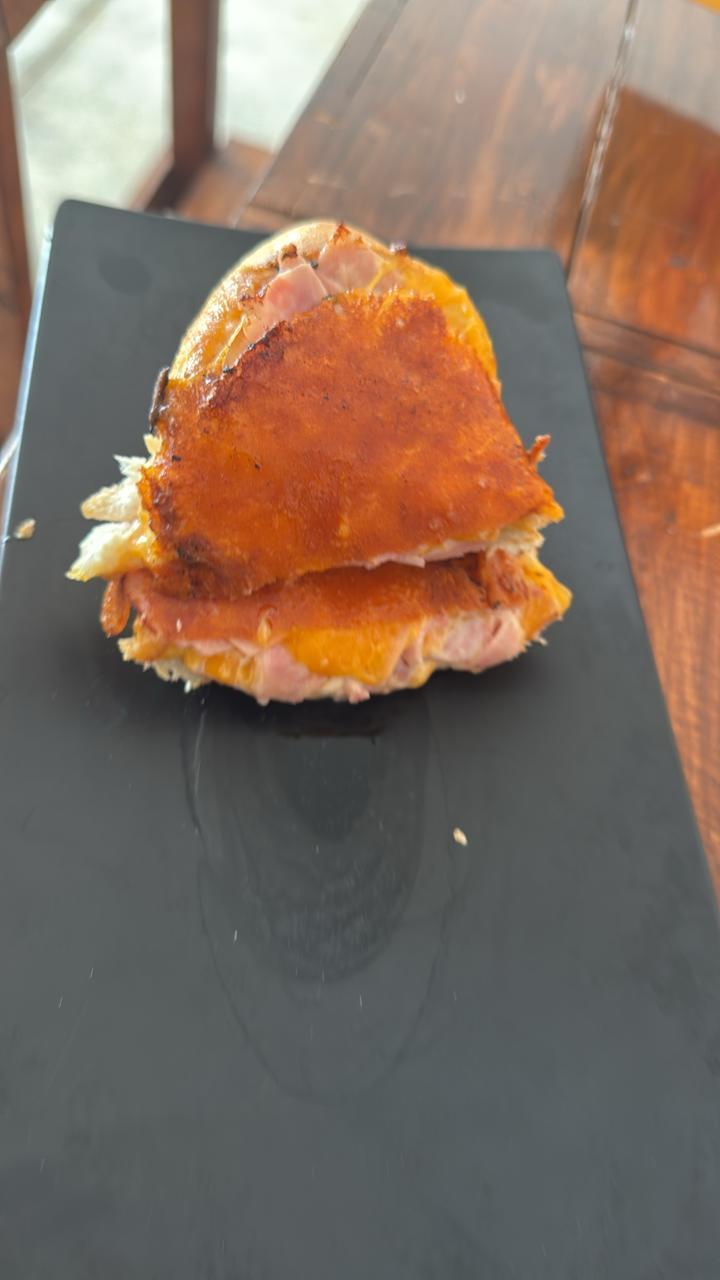 Sándwich dorado en pan de masa madre con queso mozzarella y cheddar derretidos, acompañado de aderezo de la casa y papas o pretzels.