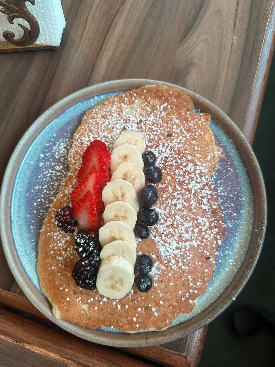 Suaves hot cakes, azúcar espolvoreada y acompañados de plátano fresco.