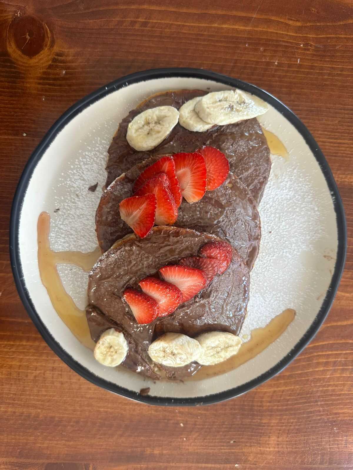 Esponjosos hot cakes cubiertos con Nutella, chispas de chocolate, azúcar espolvoreada y frutas frescas como plátano y fresa.
