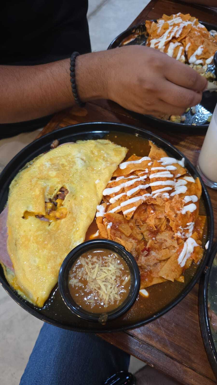 Omelette cocido, relleno de queso derretido, jamón y tocino, acompañados con frijoles refritos.