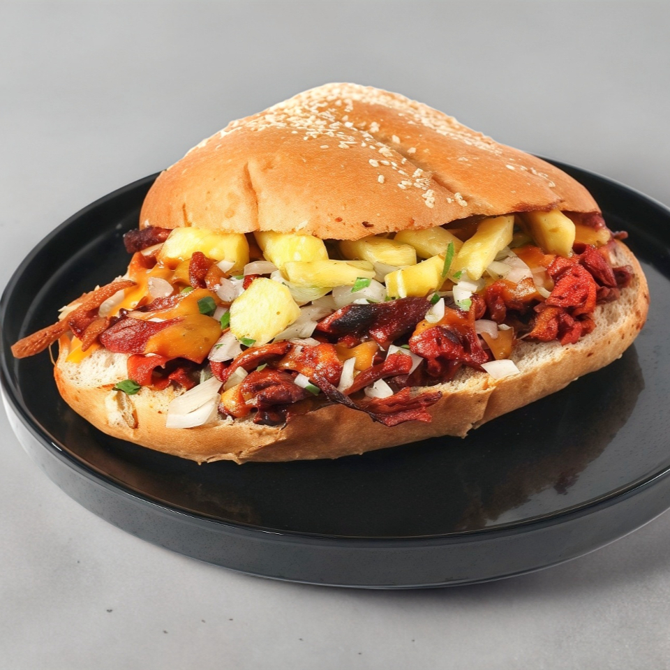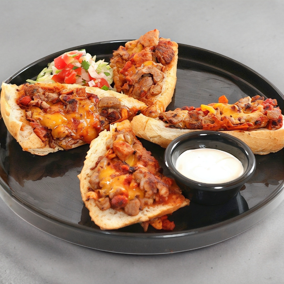 Pan bolillo crujiente por fuera y suave por dentro, untado con frijoles refritos cremosos y cubierto con queso manchego fundido y proteina a elegir.