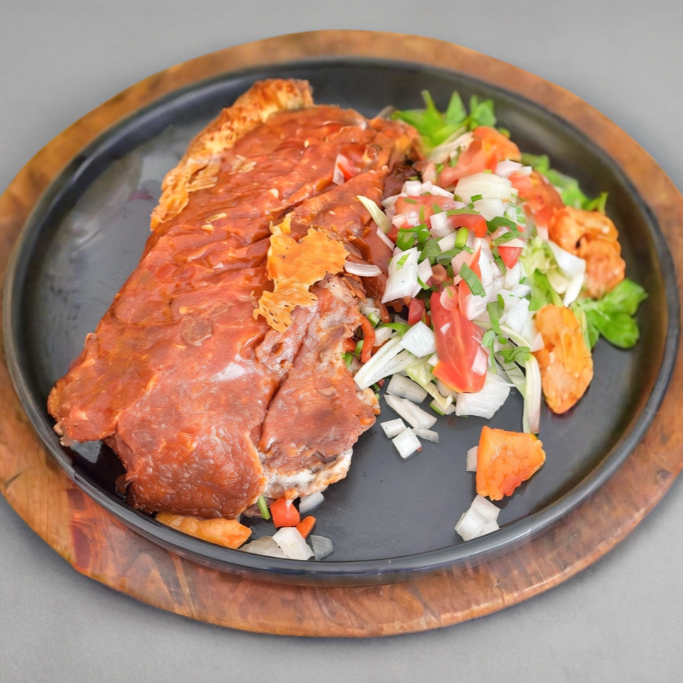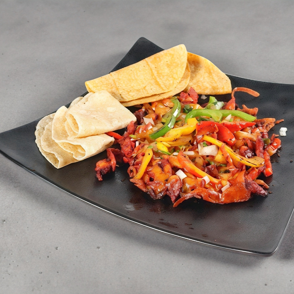 Deliciosa mezcla salteada de pimientos, cebolla y tomate fresco, fundida con queso manchego derretido y acompañada de la proteína de tu elección