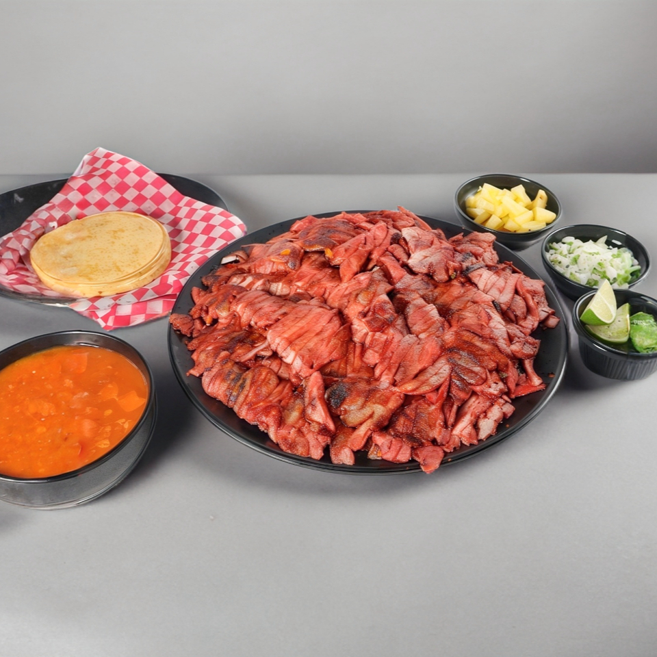 1 kg de carne a elegir acompañado de salsa de la casa, porcion de tortilla de acuerdo a gramaje y porcion de frijoles charros.