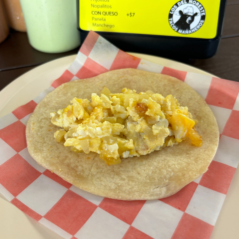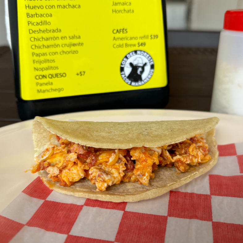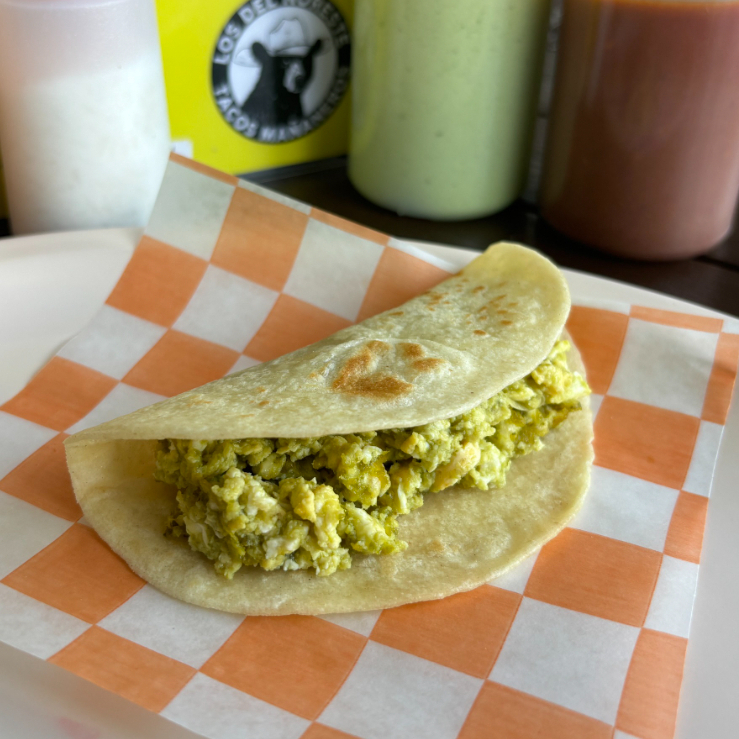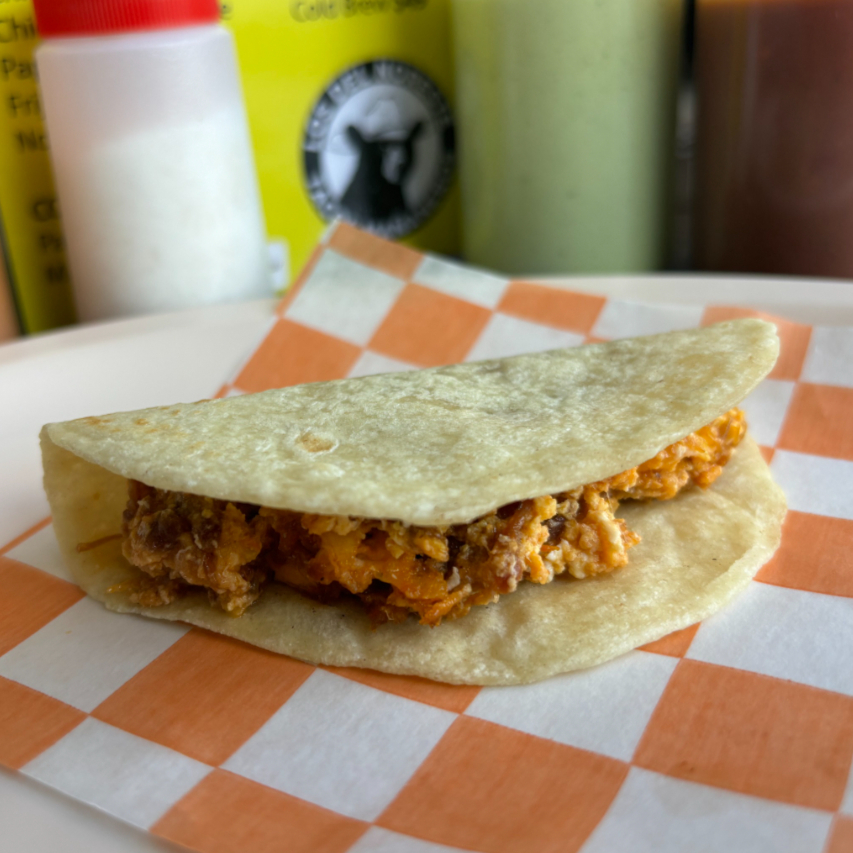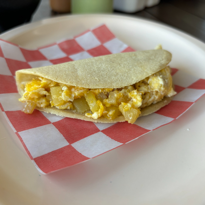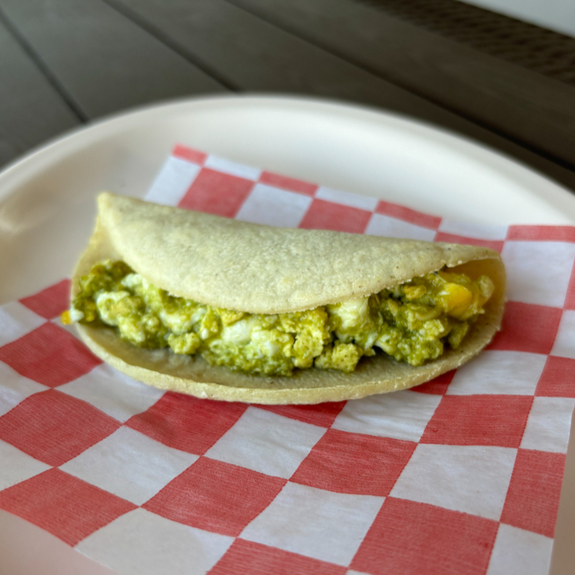 Suave huevo revuelto con un toque de chile, envuelto en tortilla de maíz.