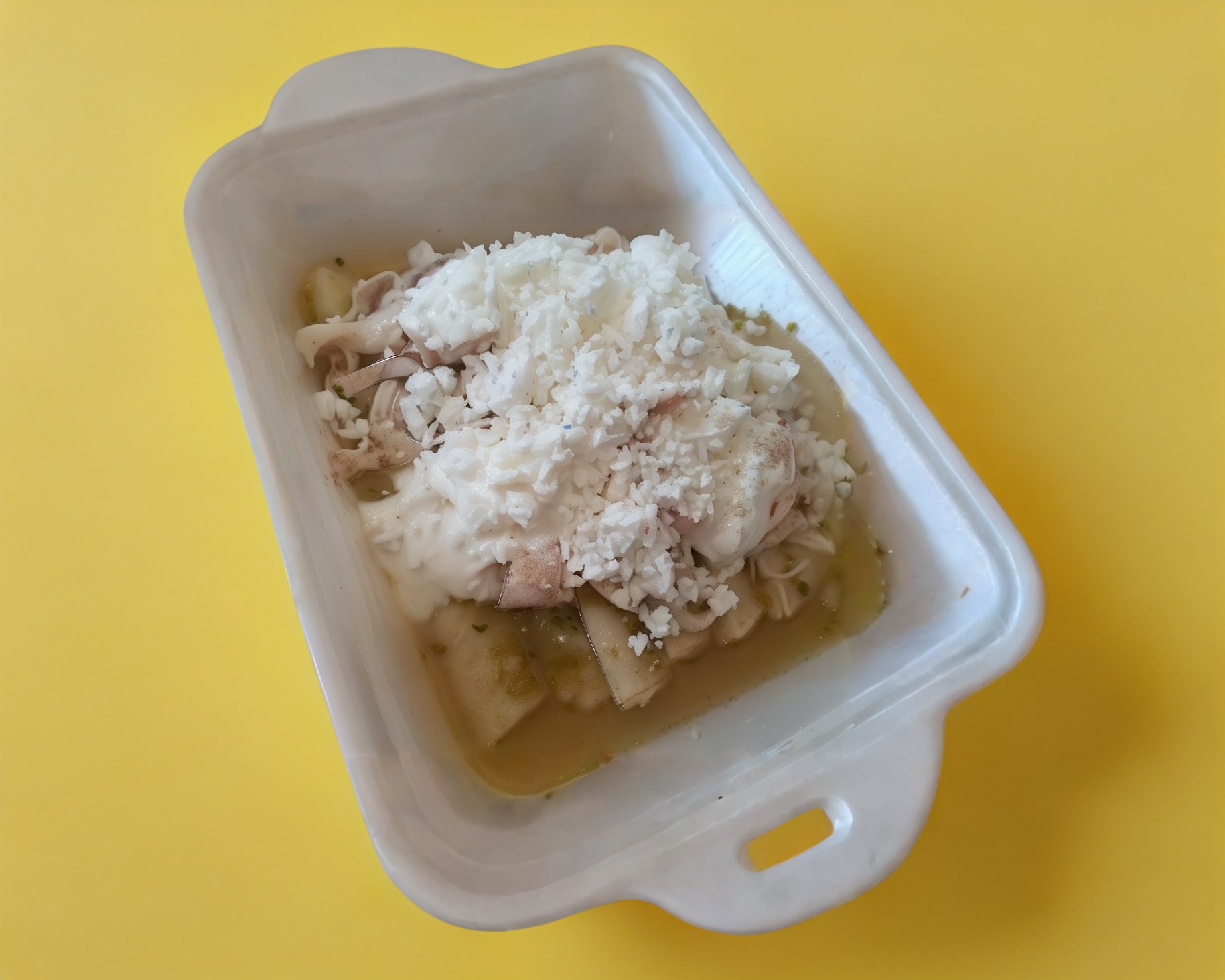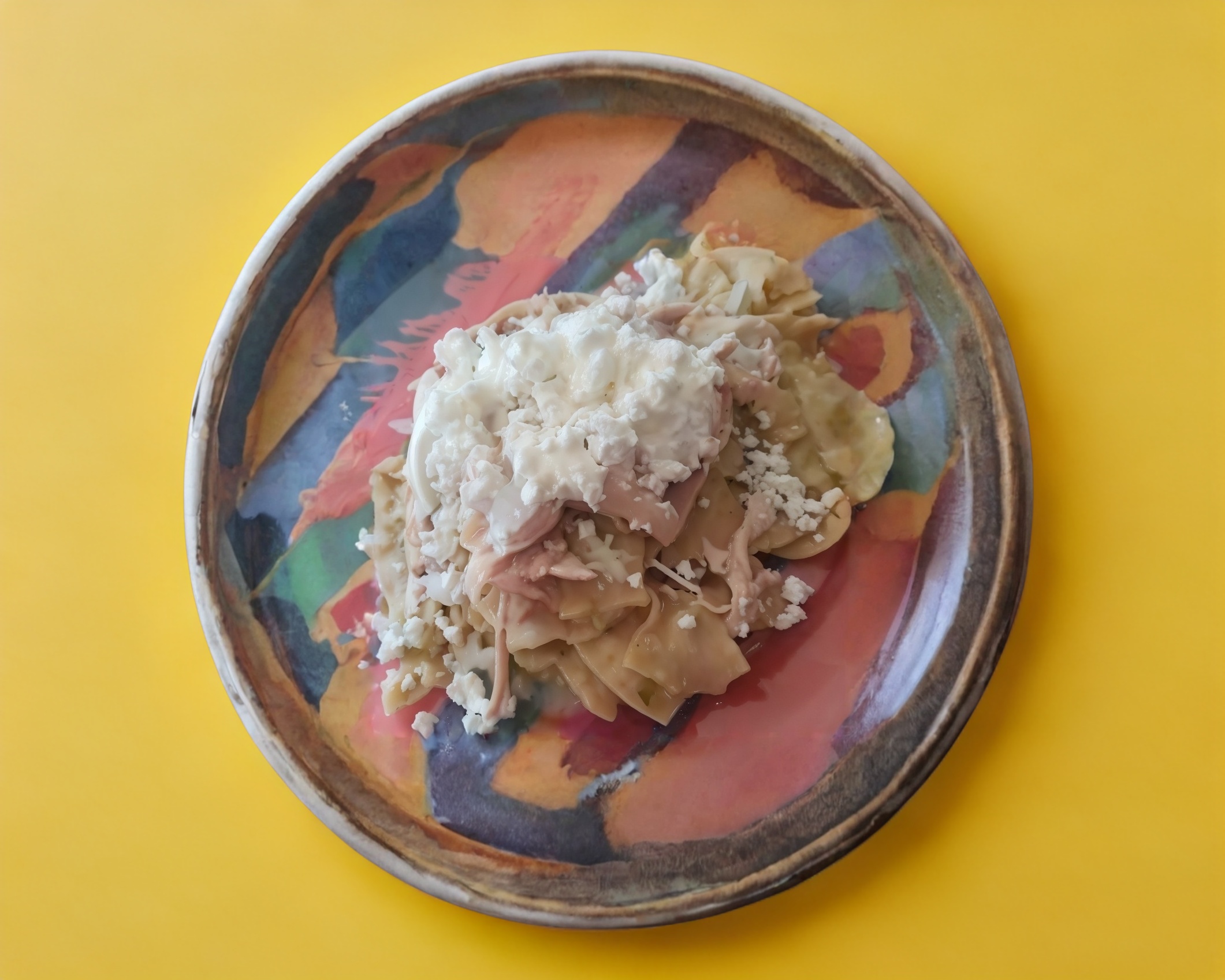totopos bañados en salsa verde pollo crema cebolla queso fresco