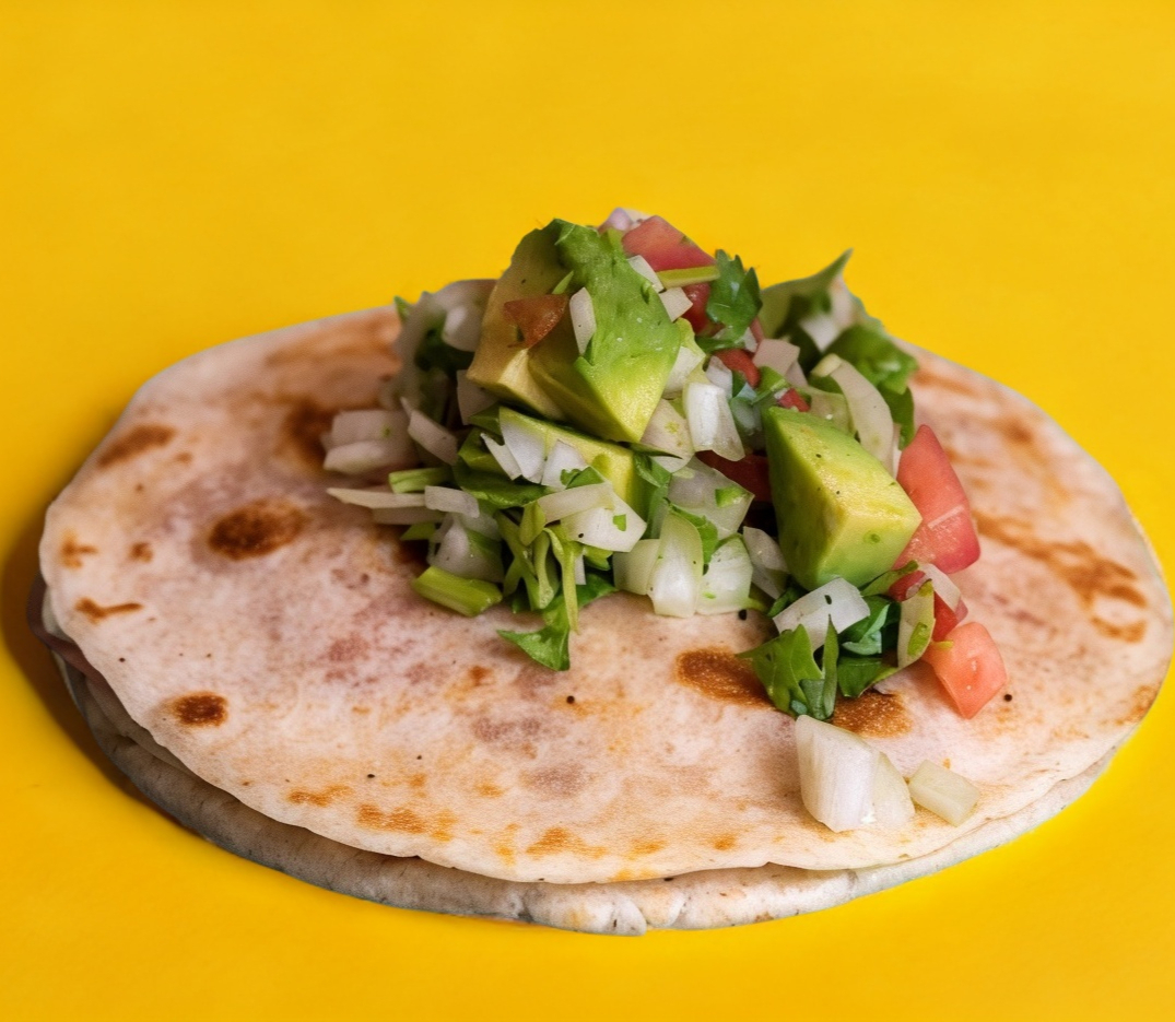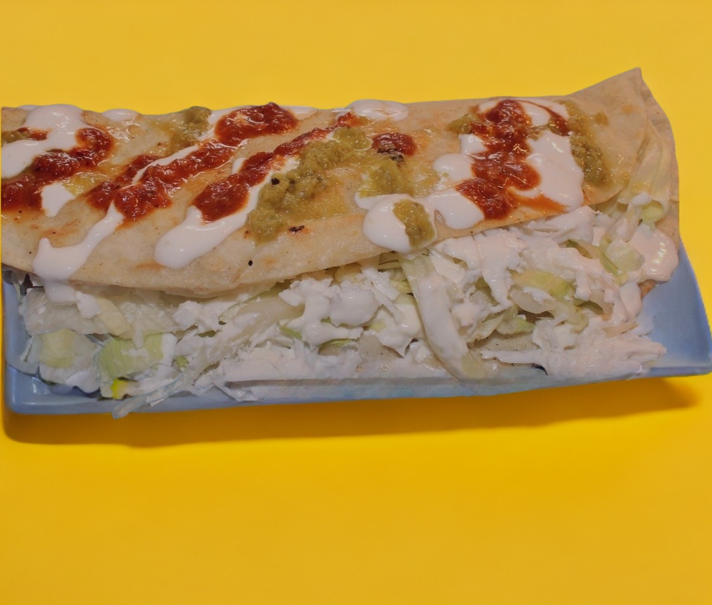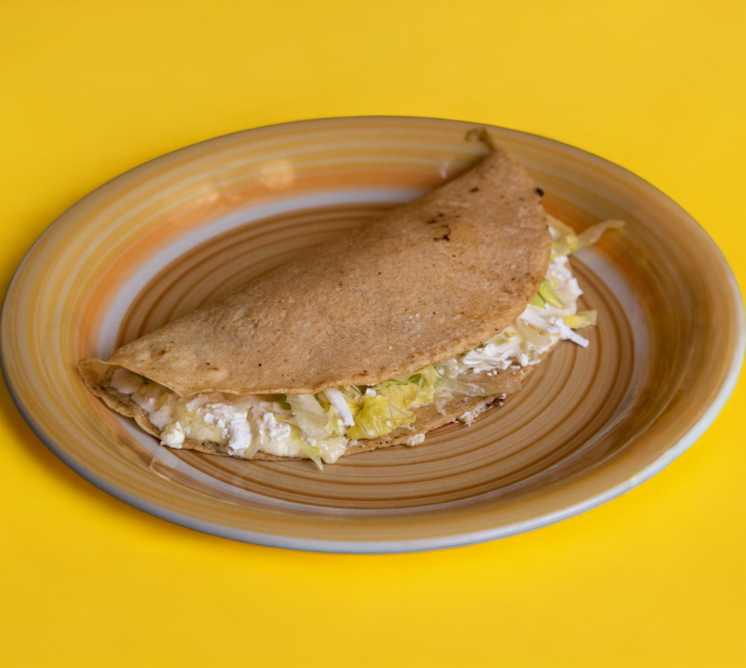 Tortilla echa a mano rellena de su guiso favorito con queso de hebra, acompañada de románita queso y crema (1pzs)