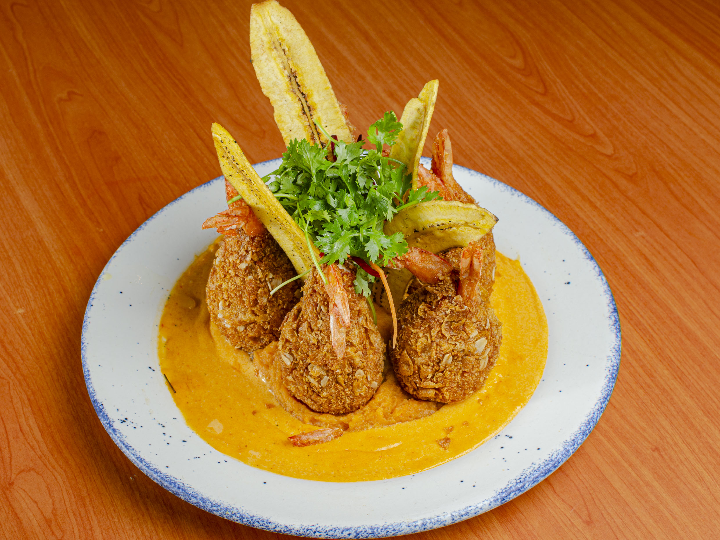 Camarones Fritos, Tocino con Chutney de Piña