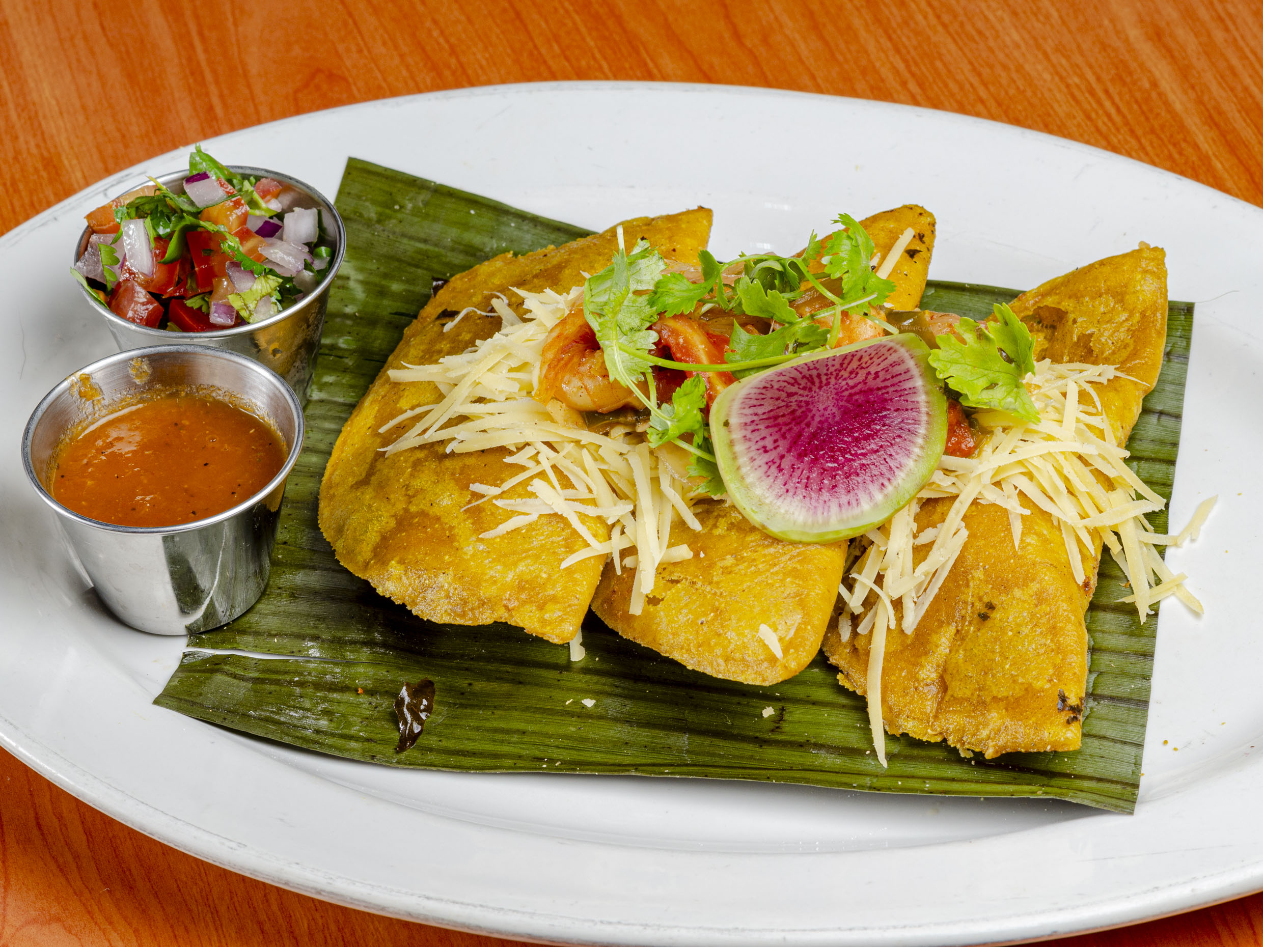 Camarones rellenos de queso, plátano frito y ensalada fresca y salsa americana.
