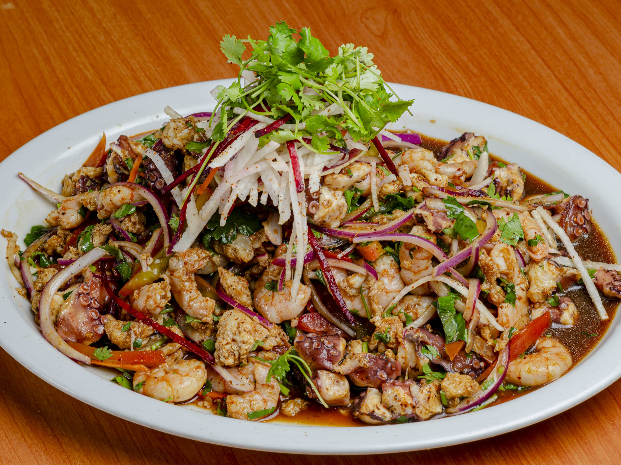 Ceviche con pulpo frito y delicios pico de gallo con jugo de limón.