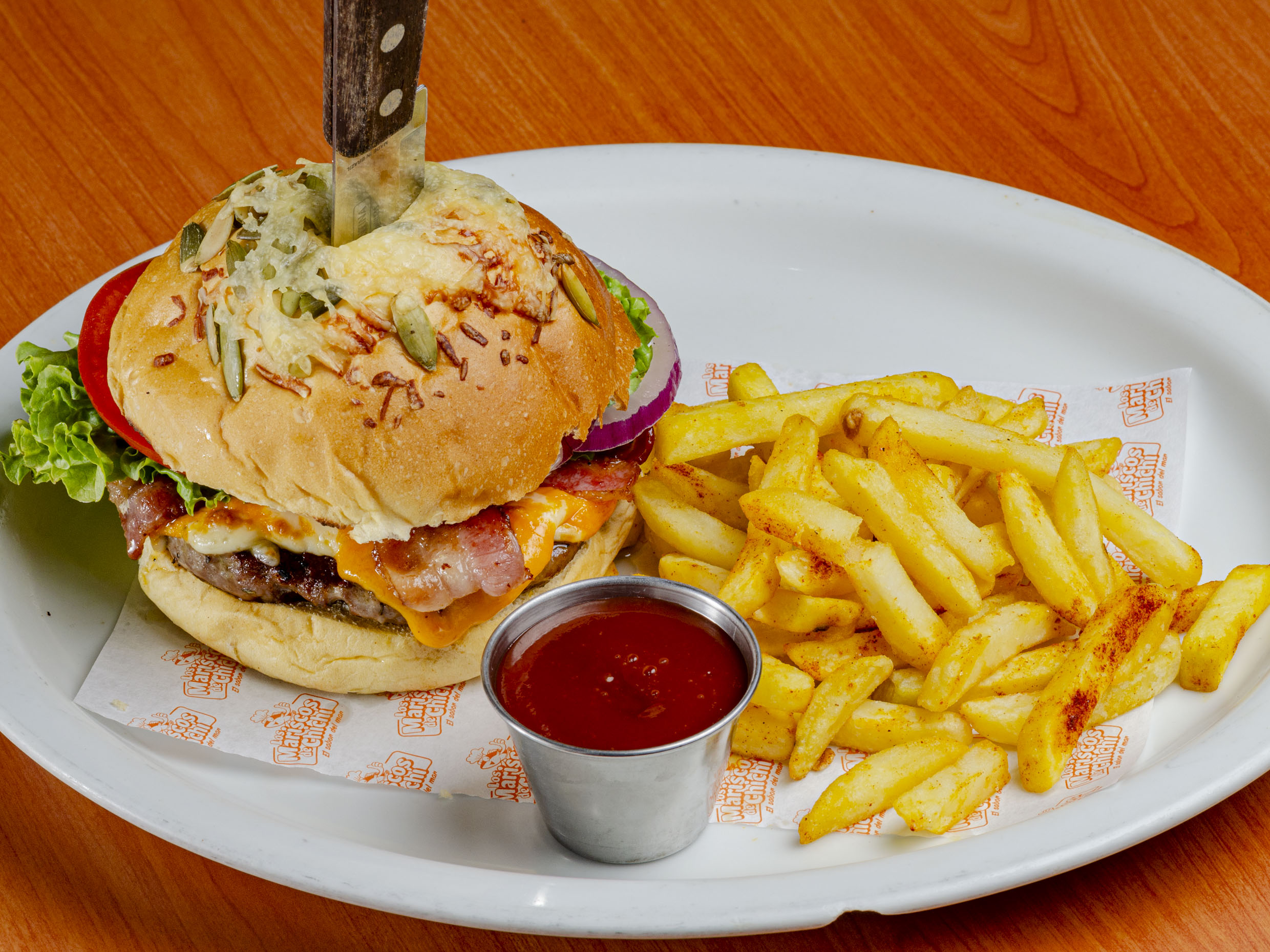 Exquisita hamburguesa crocante de camarones y jaiba salteada con salsa búfalo, mix de quesos y vegetales, acompañada de papas gajo con paprika.