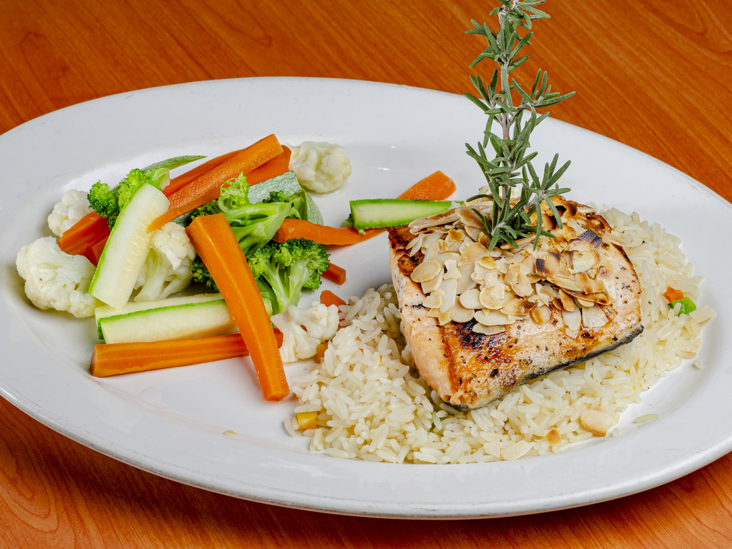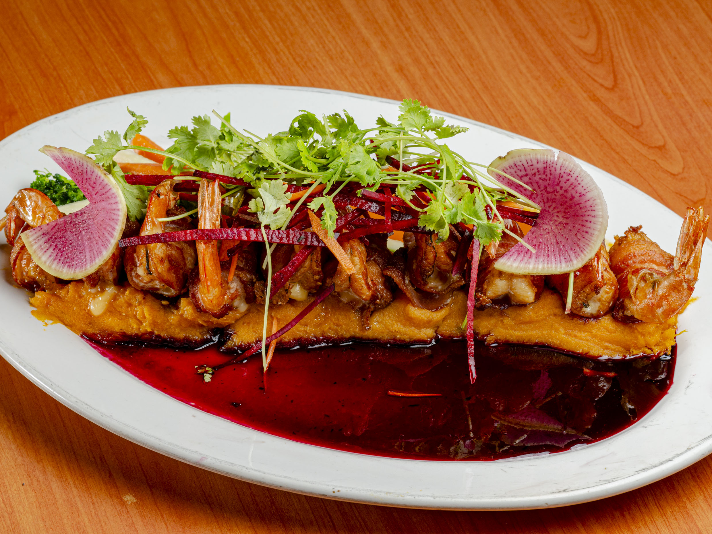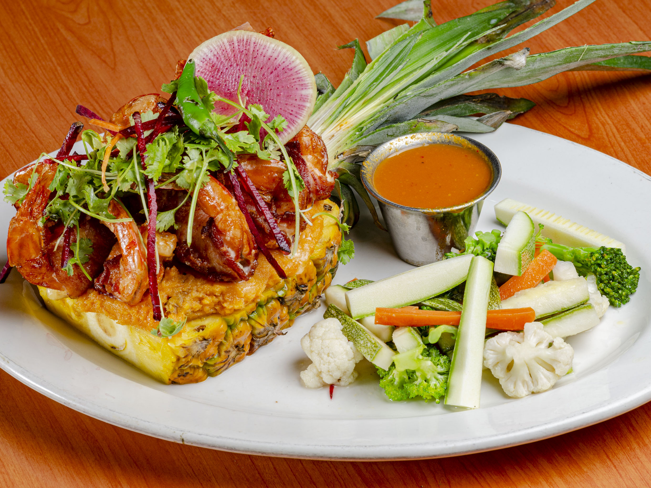 Camarones fritos con tocino y chutney de piña. acompañados de vegetales a la mantequilla y salsa chutney.