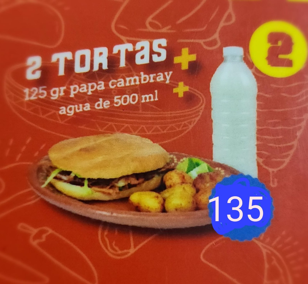 2 tortas, 125 gr de papas cambray y 1 refresco de 600 ml.