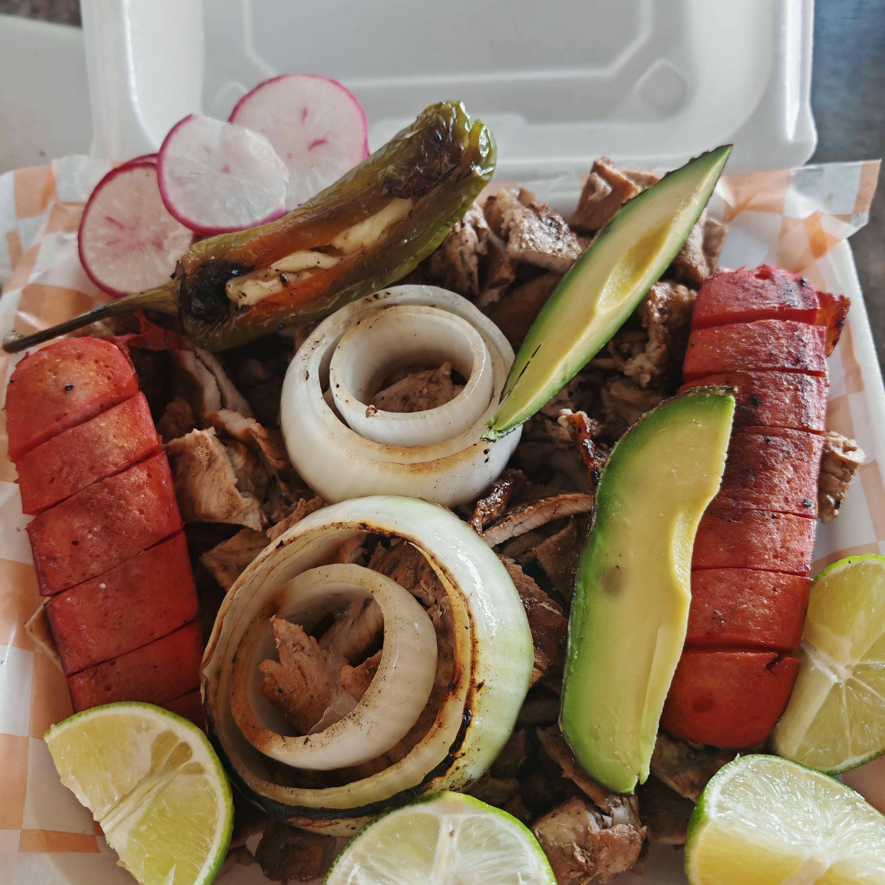 Con tortillas, limones, salsas y cebolla