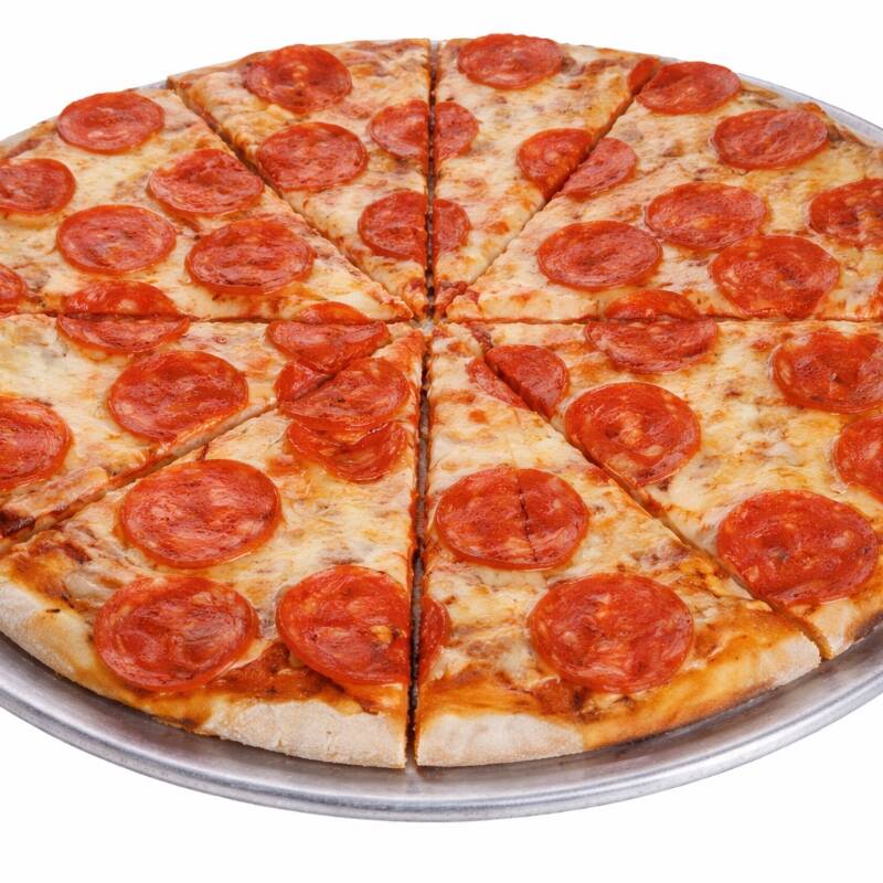 Pizza para compartir con peperoni y queso. 8 rebanadas. Complemento de salsa inglesa, salsa picante y orégano