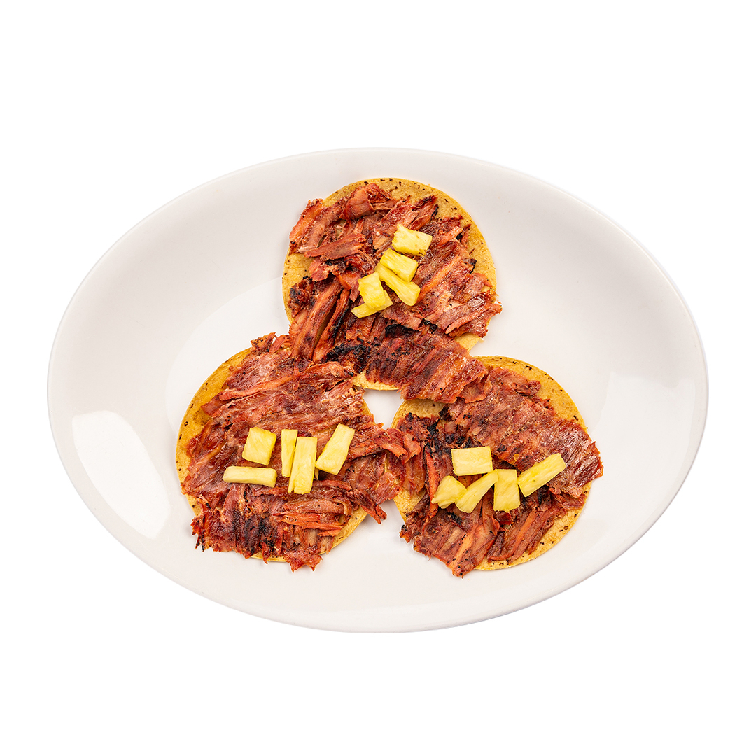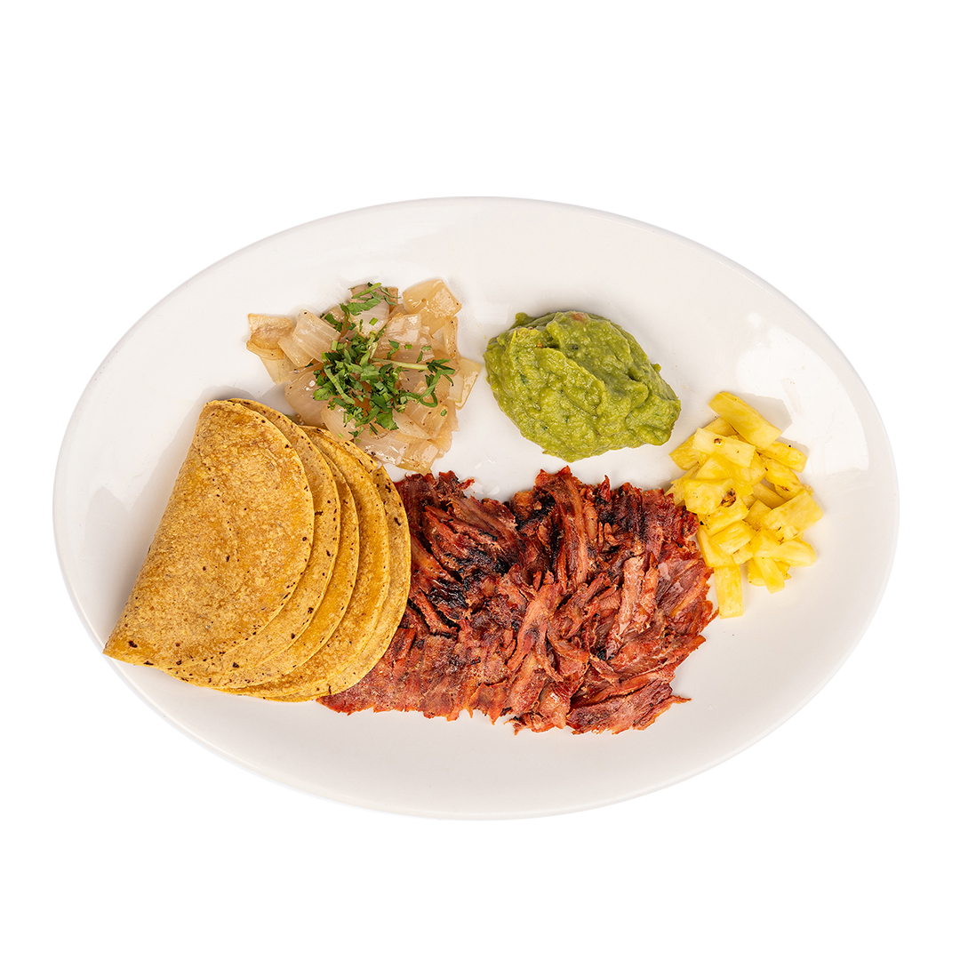 La cantidad exacta de nuestro delicioso pastor para hacer cinco tacos. Complemento de salsa roja y verde, cebolla con cilantro, limones y salsa picante.