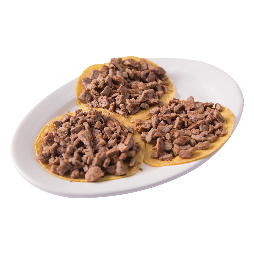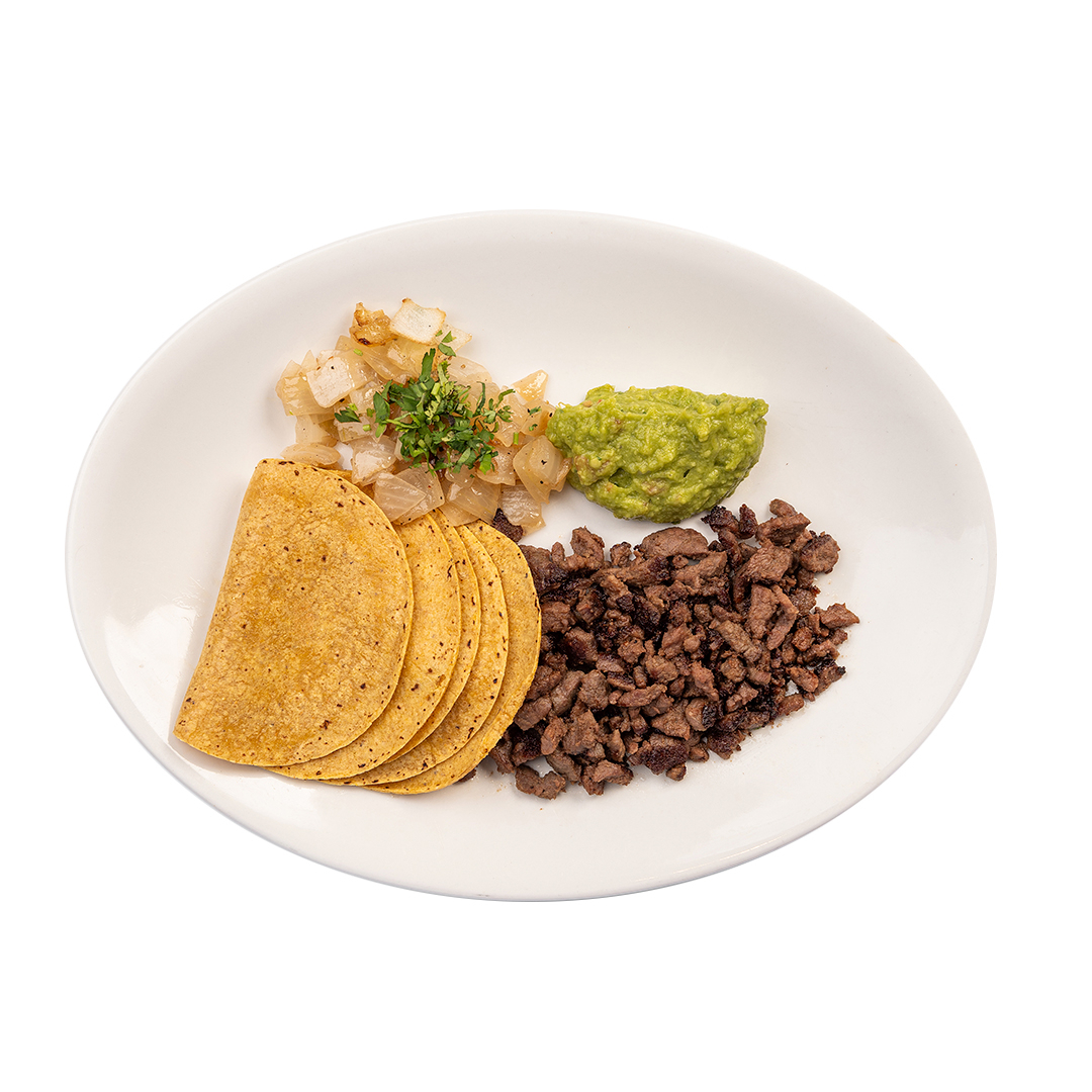 La cantidad exacta de nuestra carne de bistec para hacer cinco tacos. Complemento de salsa roja y verde, cebolla con cilantro, limones y salsa picante.