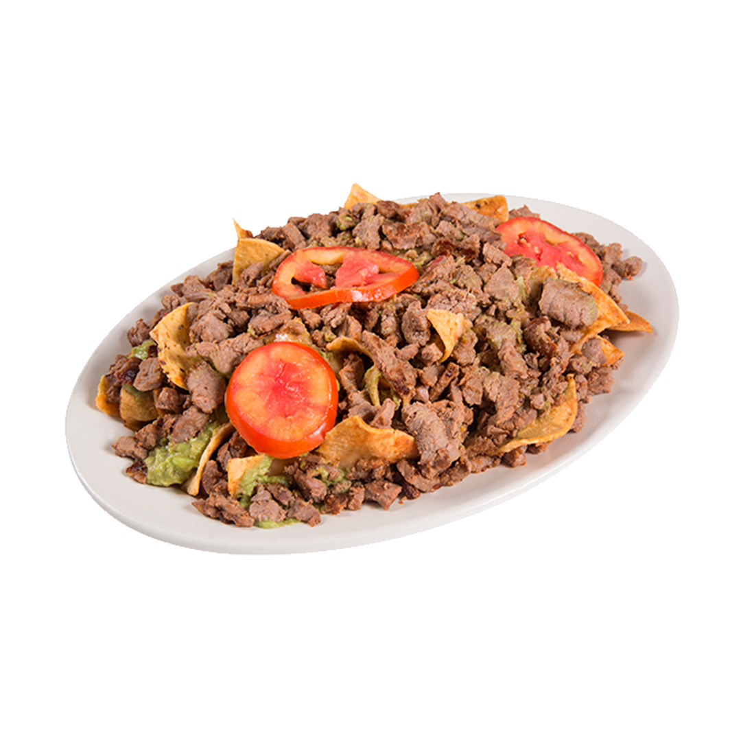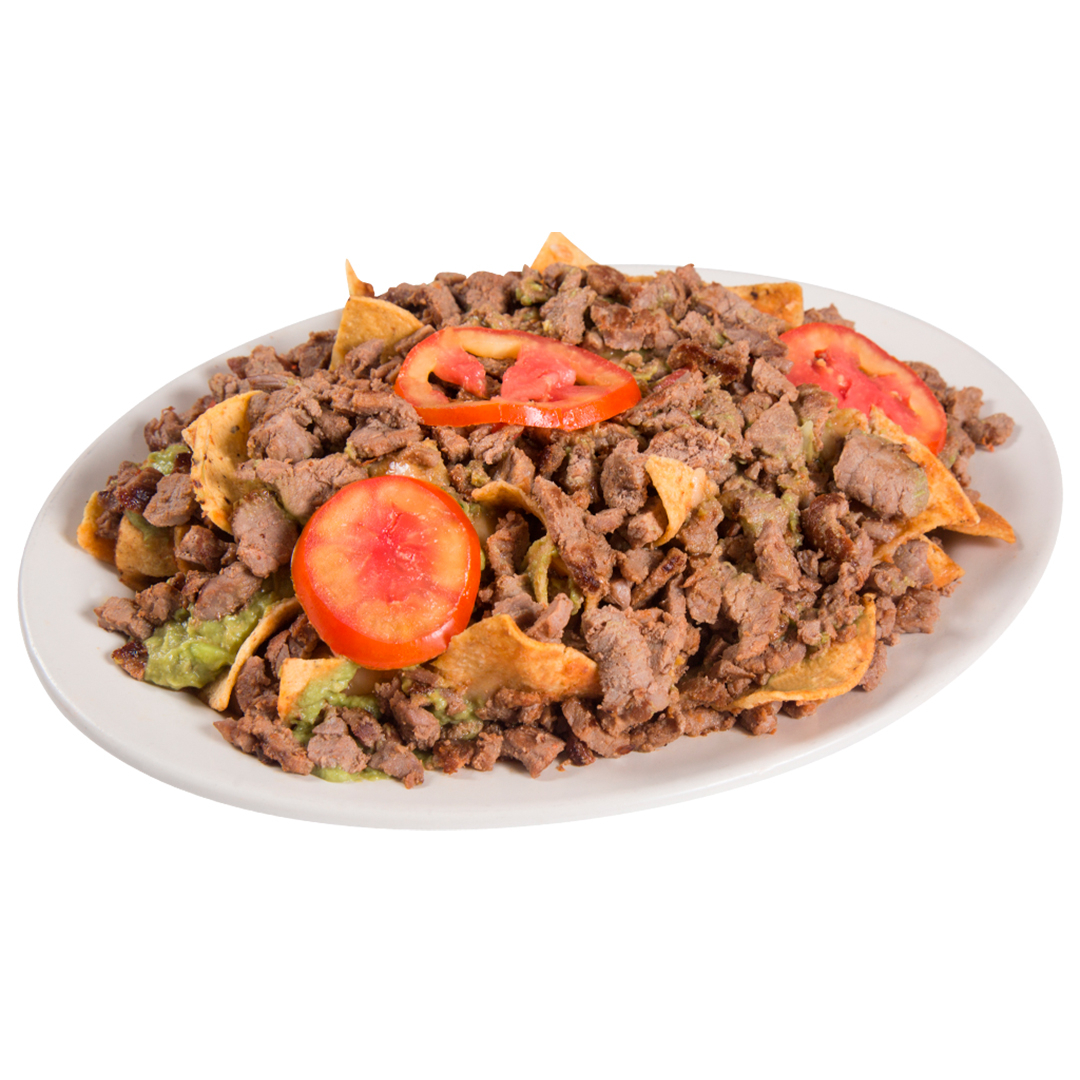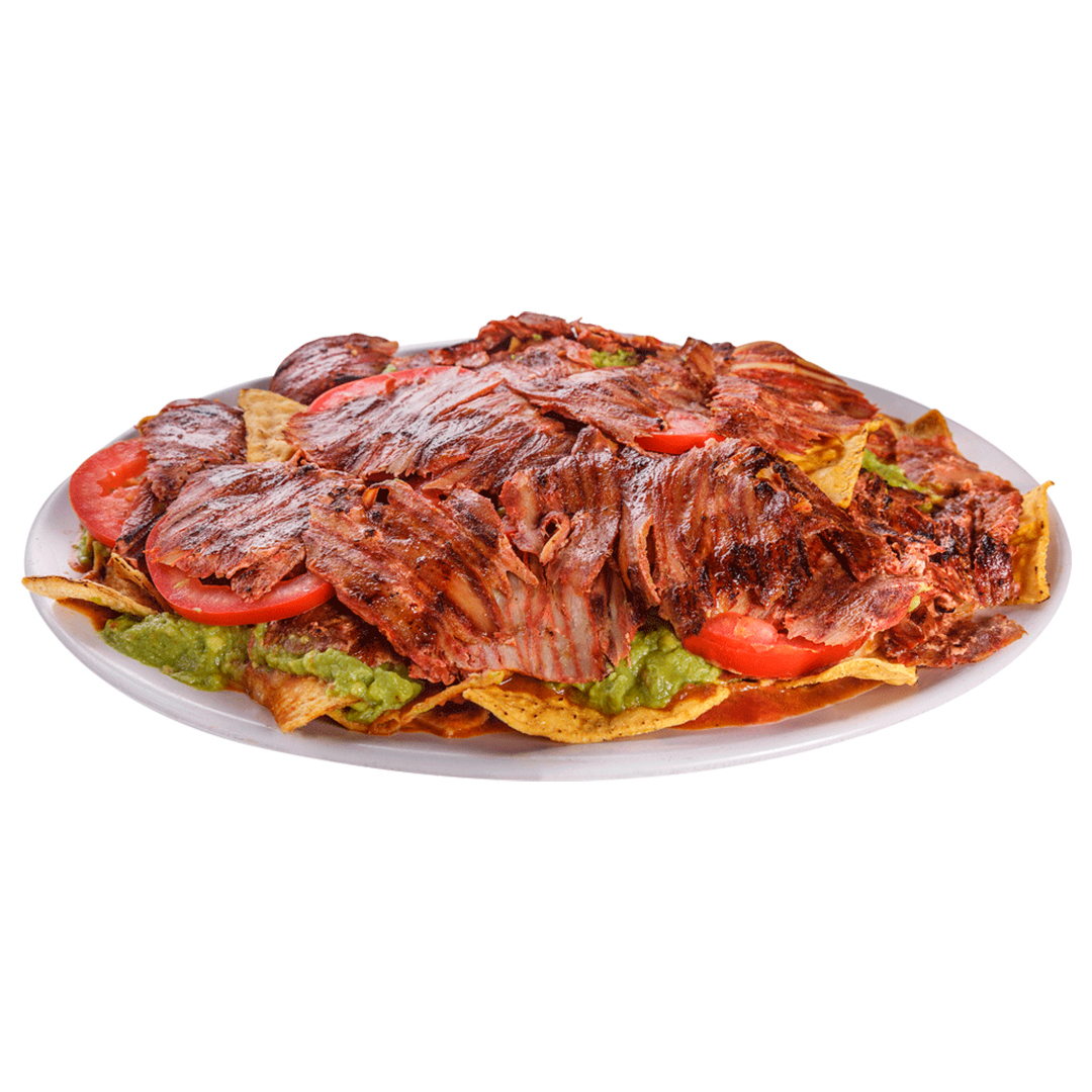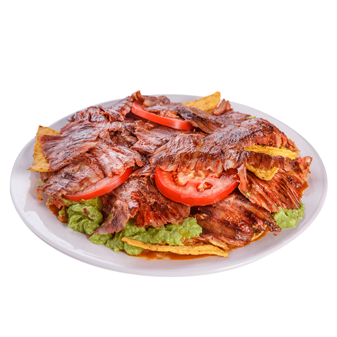 Totopos bañados con frijol, queso manchego gratinado, guacamole, tomate y carne de bistec. Para 3 a 4 personas. Complemento de salsa roja y verde, cebolla con cilantro, limones y salsa picante.