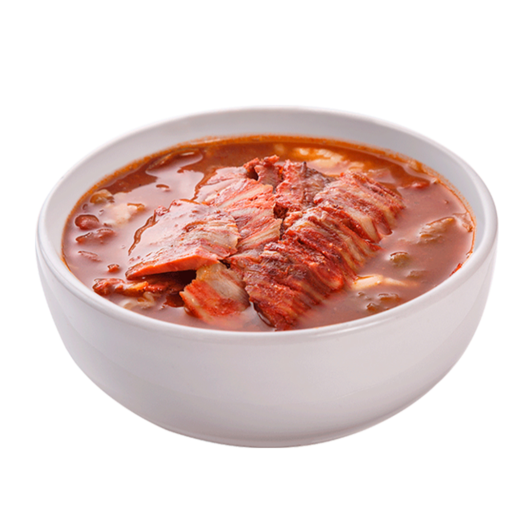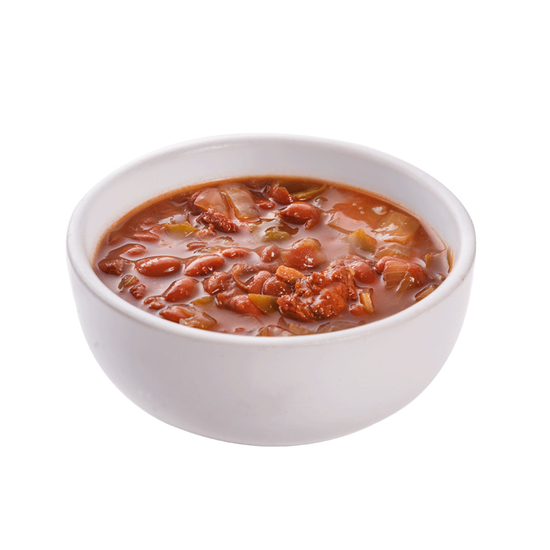 Frijoles bayos, morrón, cebolla, tocino y chorizo, natural sin carne y sin queso manchego.