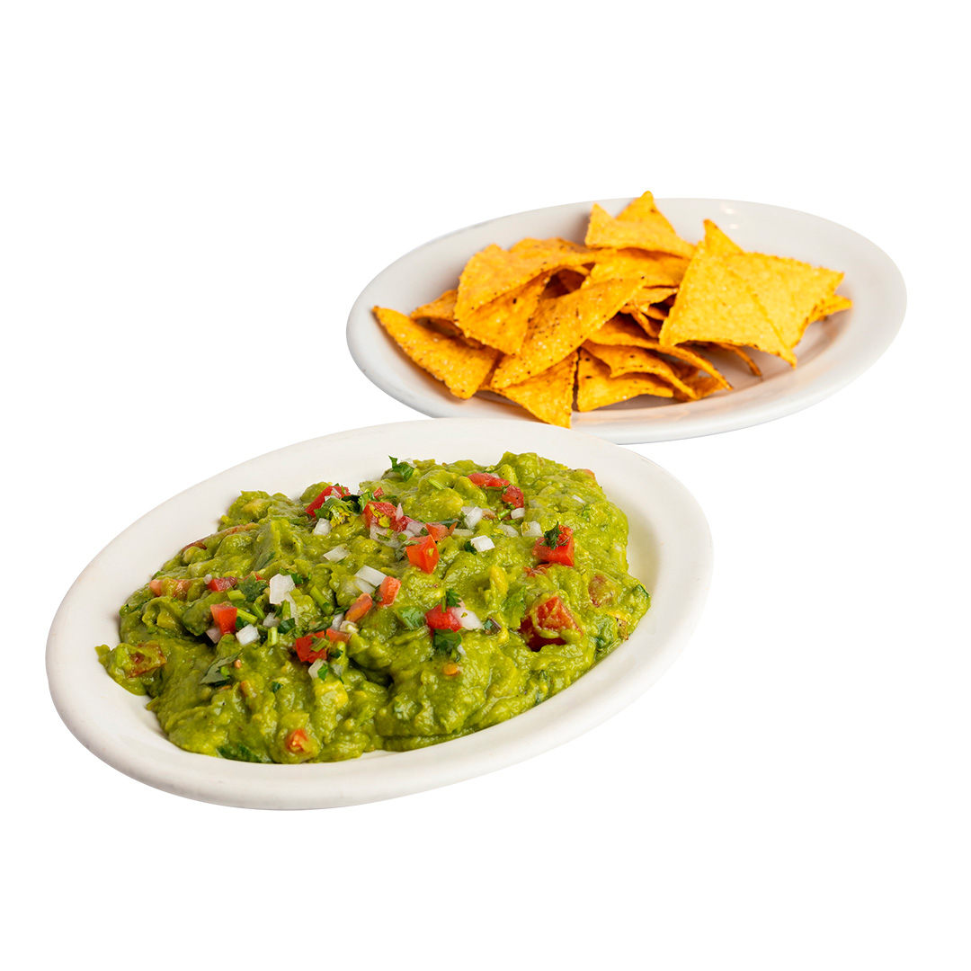 Pulpa de aguacate hass mezclado con cebolla, tomate en cubos y cilantro, acompañado con dos bolsas de totopos.