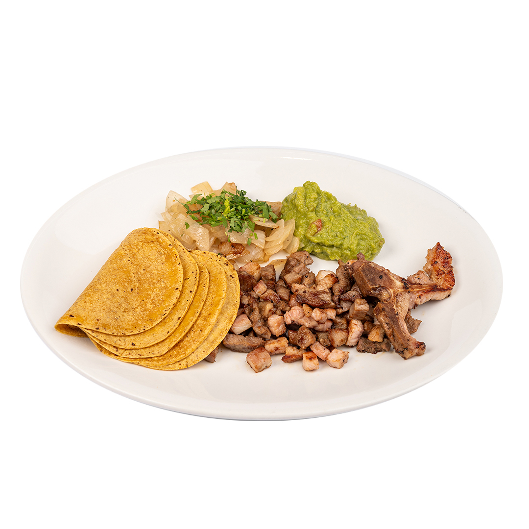 La cantidad exacta de nuestra carne de chuleta para hacer cinco tacos. Complemento de salsa roja y verde, cebolla con cilantro, limones y salsa picante.