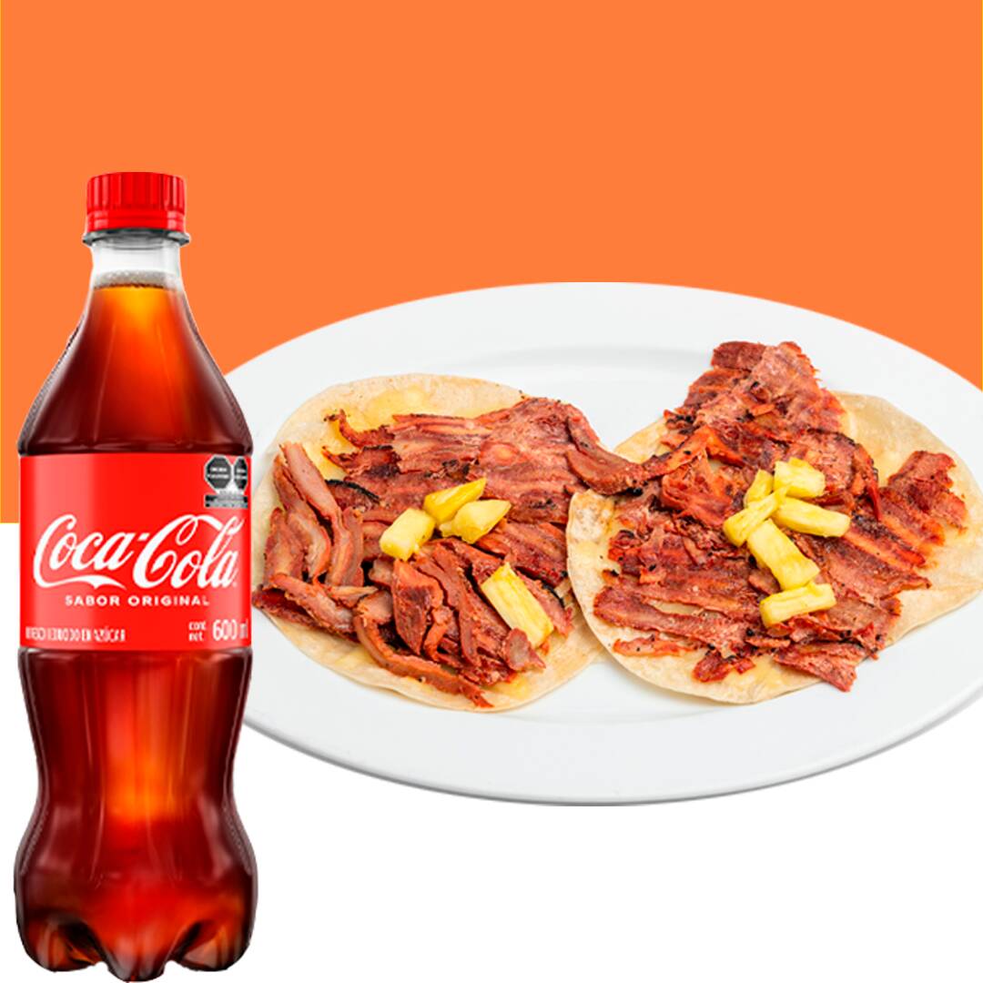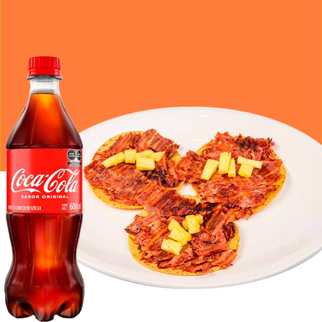 3 Tacos de Pastor más Coca Cola 600 Ml