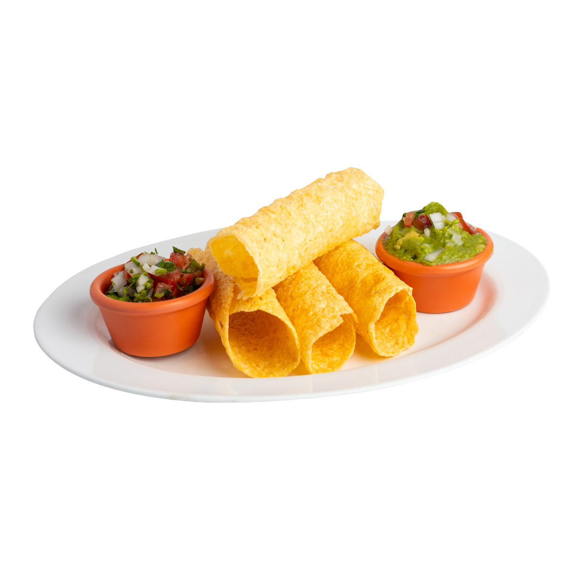 Chicharrón de queso parmesano, acompañado de una porción de pico de gallo y guacamole.