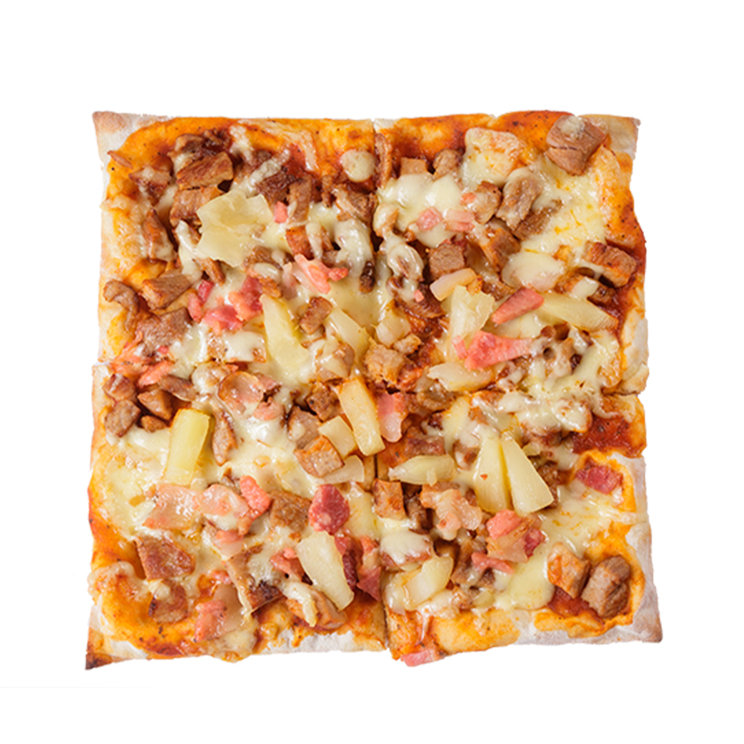 Pizza de 4 rebanadas con carne de chuleta de cerdo, tocino, piña y queso. Complemento de salsa roja y verde, cebolla con cilantro, limones, salsa picante.