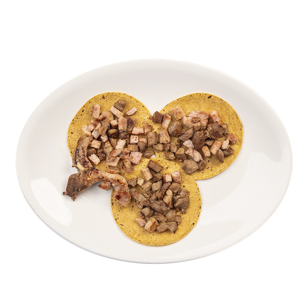 Orden de tres tacos de chuleta. Complemento de salsa roja y verde, cebolla con cilantro, limones y salsa picante.