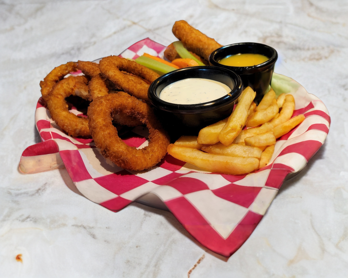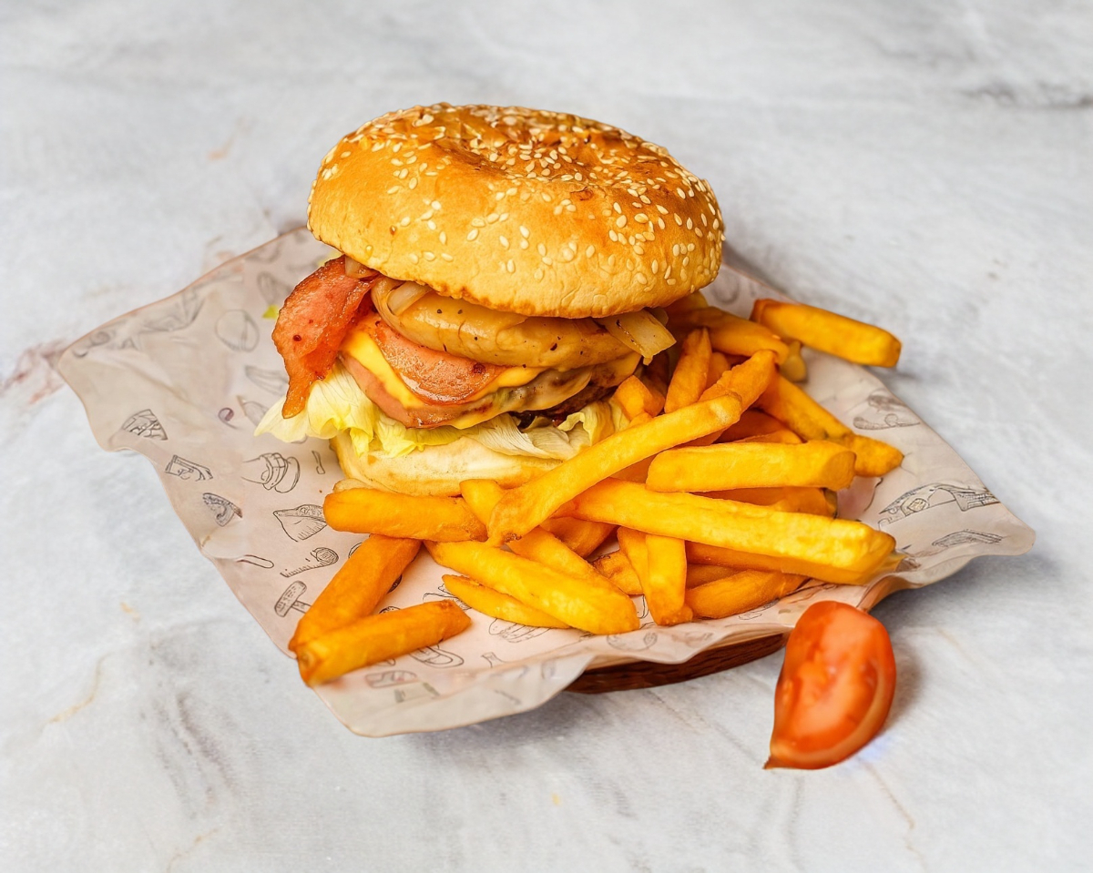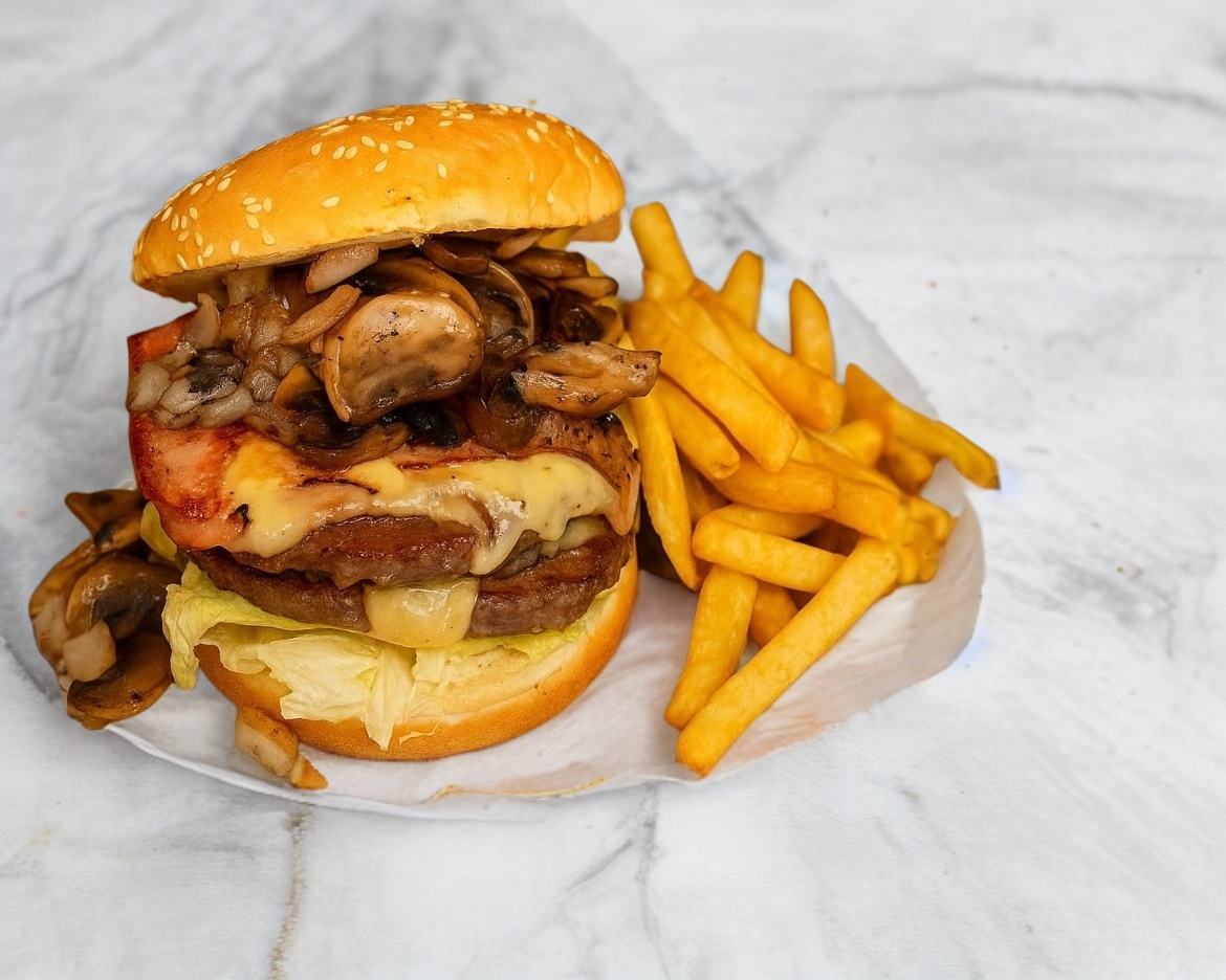 Doble carne de res con queso, champiñones frescos, jamón, aros de cebolla y vegetales, acompañada de una porción de papas a la francesa.