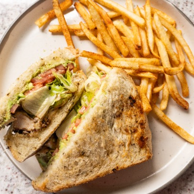Pechuga de pollo, queso cheddar y tocino, acompañado con papas a la francesa y aderezo Luun.
