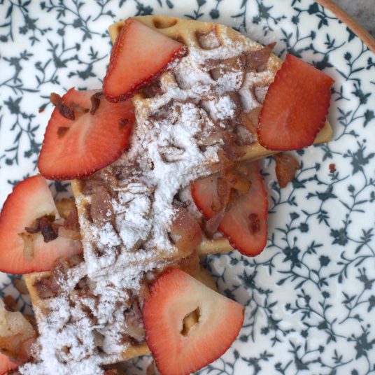 Esponjosos waffles con topping de fresa fresca y tocino crujiente.