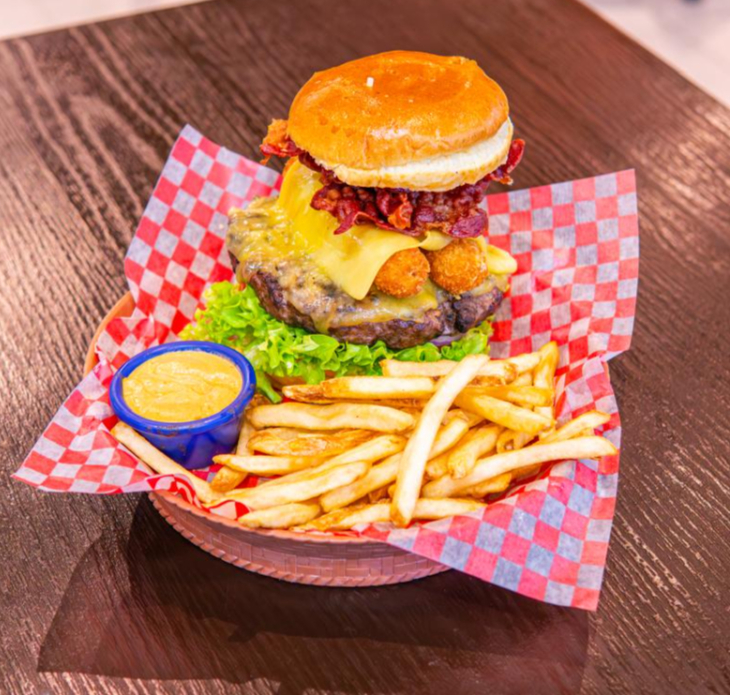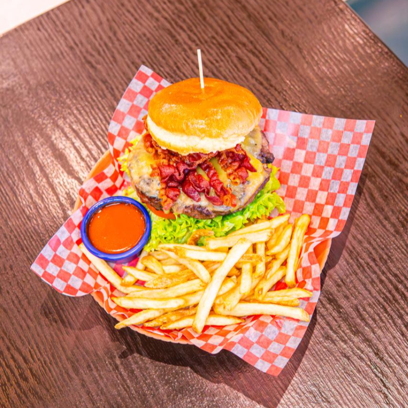 Res, queso gouda, tocino y dedos de queso integrados. Incluye papas.