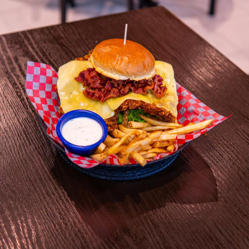 Pechuga crujiente con tocino, queso gouda y papas a la francesa.