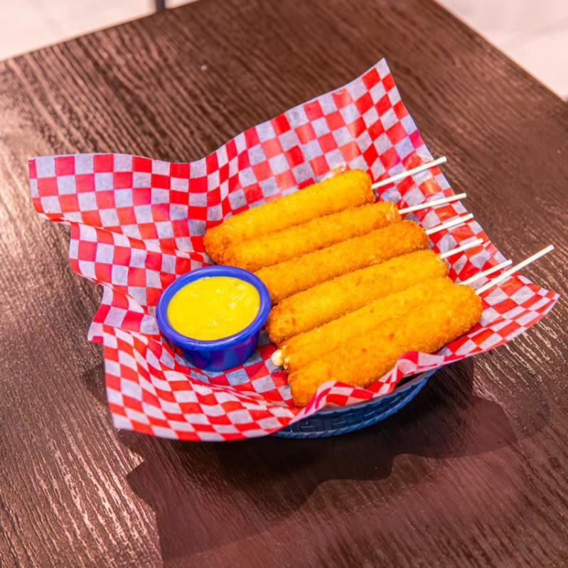 6 Bastones de queso mozzarella fundido con empanizado crujiente y un aderezo.