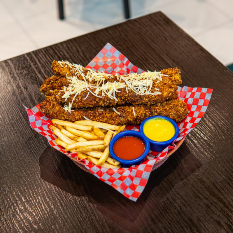 El festín ideal: 4 tiras de pollo crispy grandes, papas a la francesa y 2 aderezos.