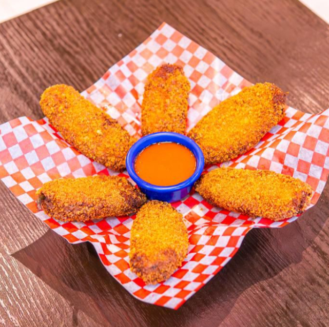 6 Chiles empanizados rellenos de nuestro dip especial; una explosión de sabor y picante sutil.