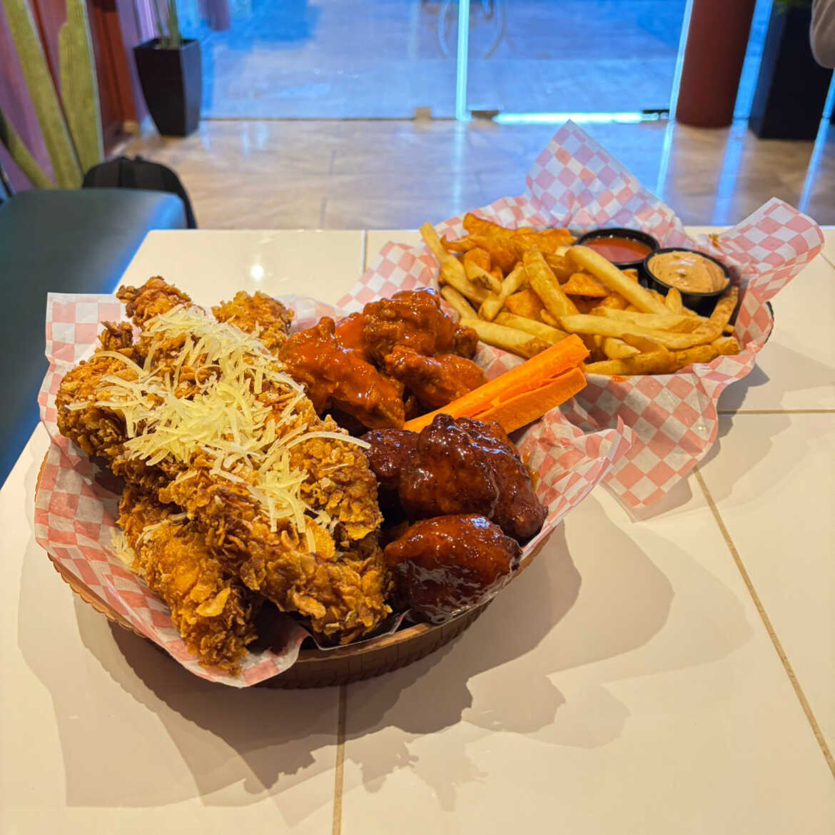 Perfecto para dos: 6 boneless, 6 alitas, 4 tiras grandes, papas gajo, francesas y 2 aderezos.