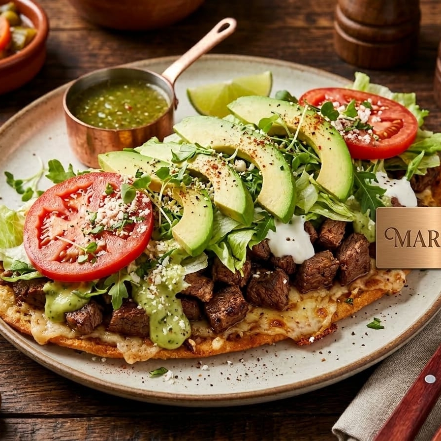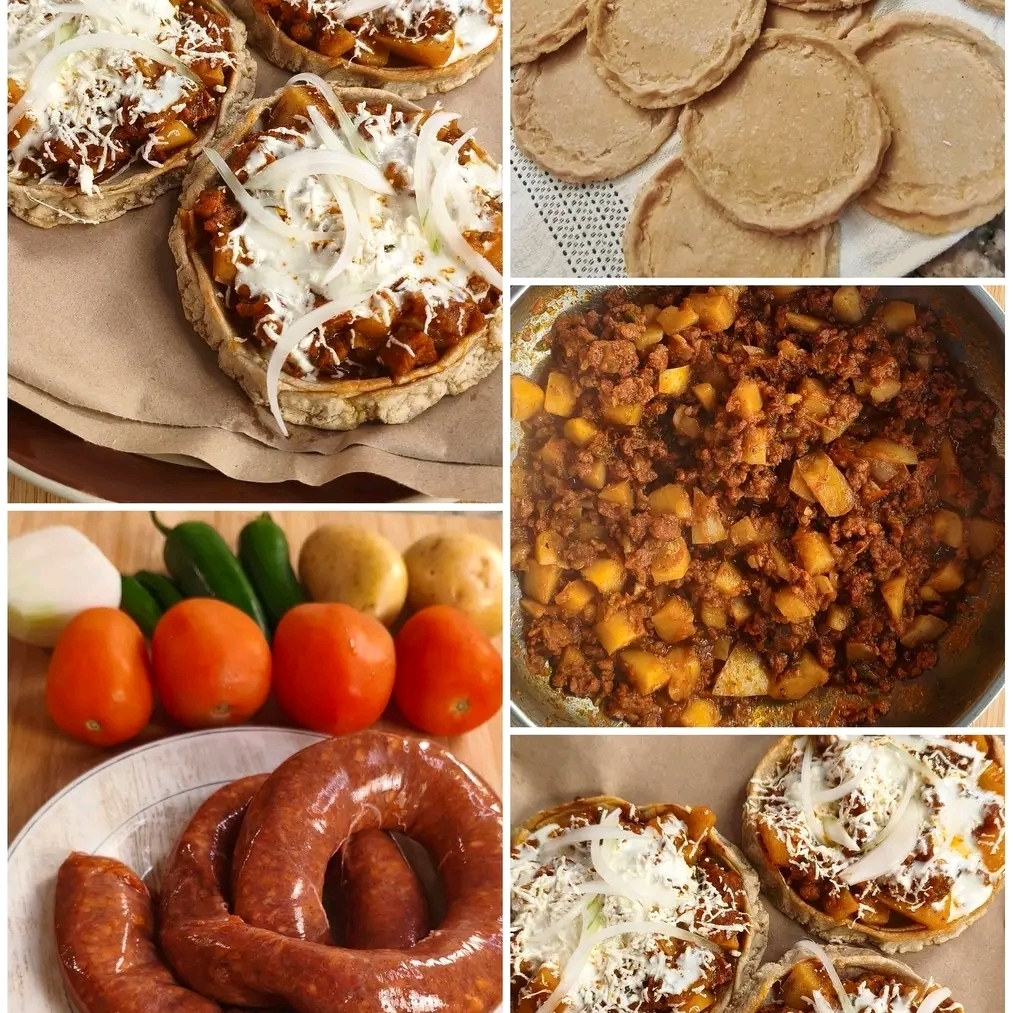De chorizo con papa, asada, pollo o tinga acompañada de frijol, lechuga, cebolla, crema y salsas al gusto.