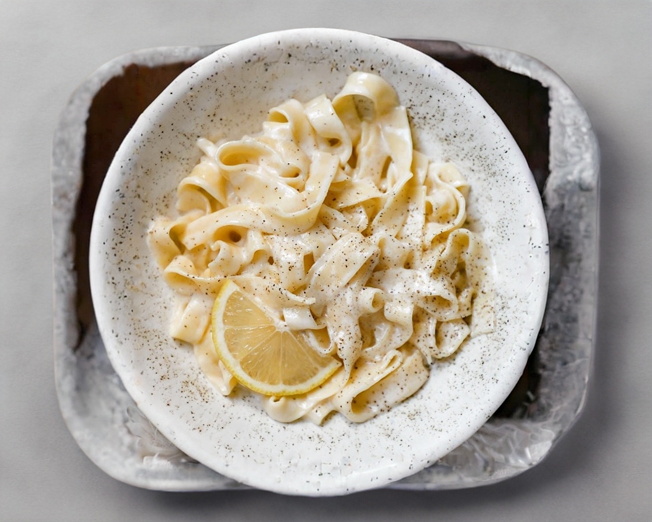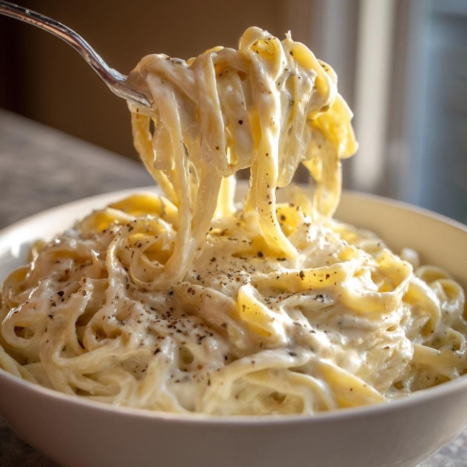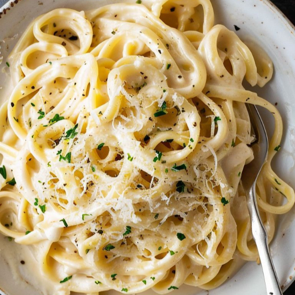 Fettuccine hecho a mano bañado en salsa blanco con tocino y un ligero toque de limón. Acompañado de una porción de pollo crispy, pan de ajo y aderezo