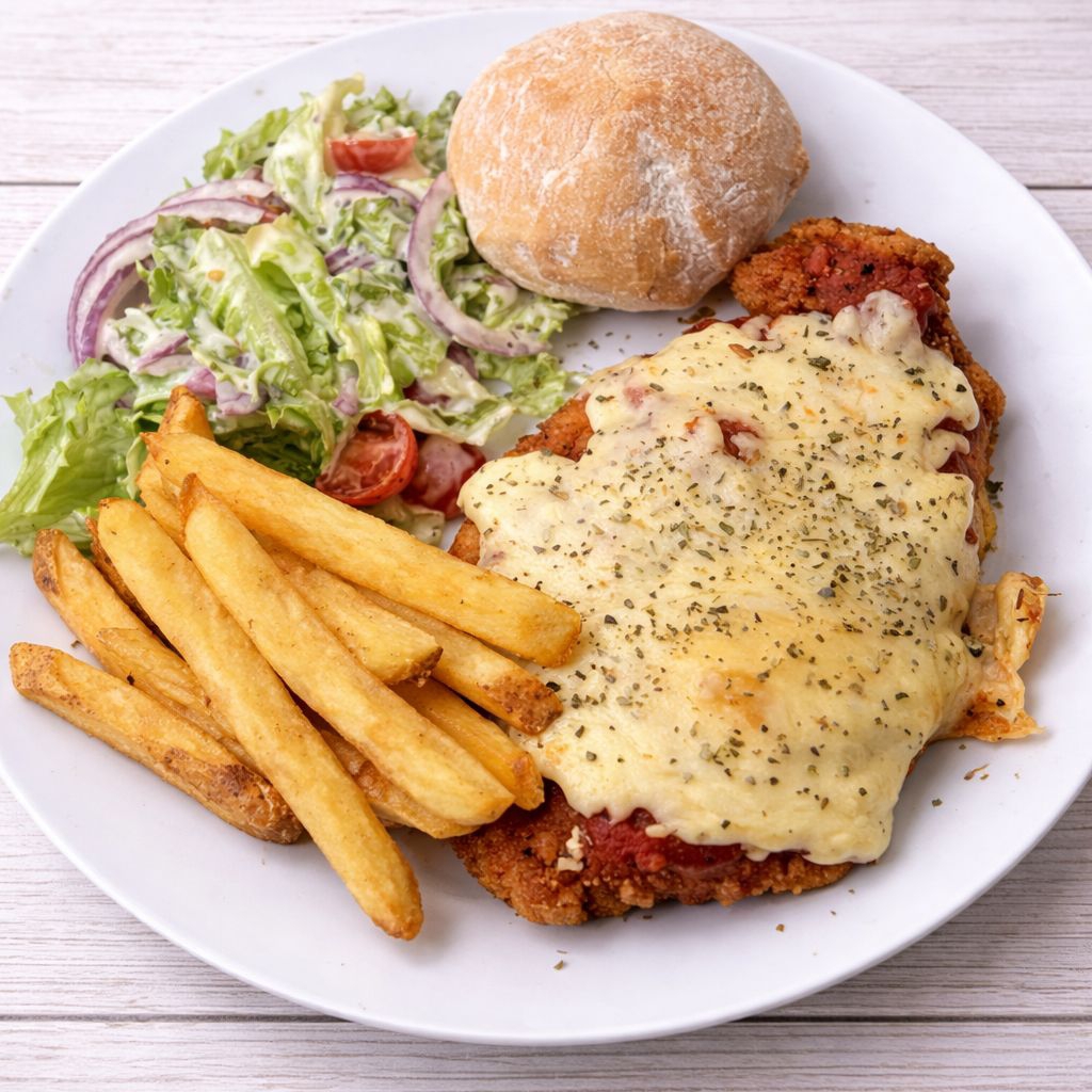200gr de pechuga de pollo empanizada, cubierta de salsa pomodoro y queso Mozarella gratinado. Acompañada de ensalada ranch, papas a la francesa y un pan