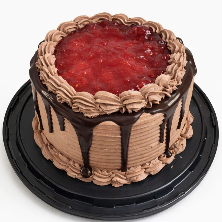 pastel de ChocoFresa de 6 a 8 personas., con pan de chocolate, mojado de tres leches, con relleno de chocolate y fresas y cubierto de chantilly de chocolate.