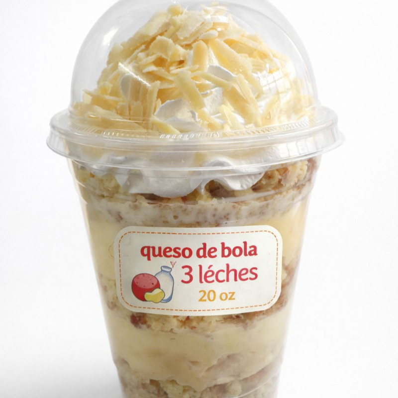 Vaso de queso de Bola, con tres leches, y pan de vainilla. en vaso de 20 onzas