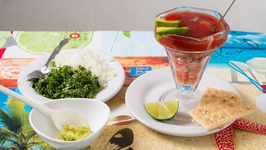 Camarón, caracol, pulpo, ostión, cebolla, cilantro, aceite de oliva, limón, galletas, chile habanero.